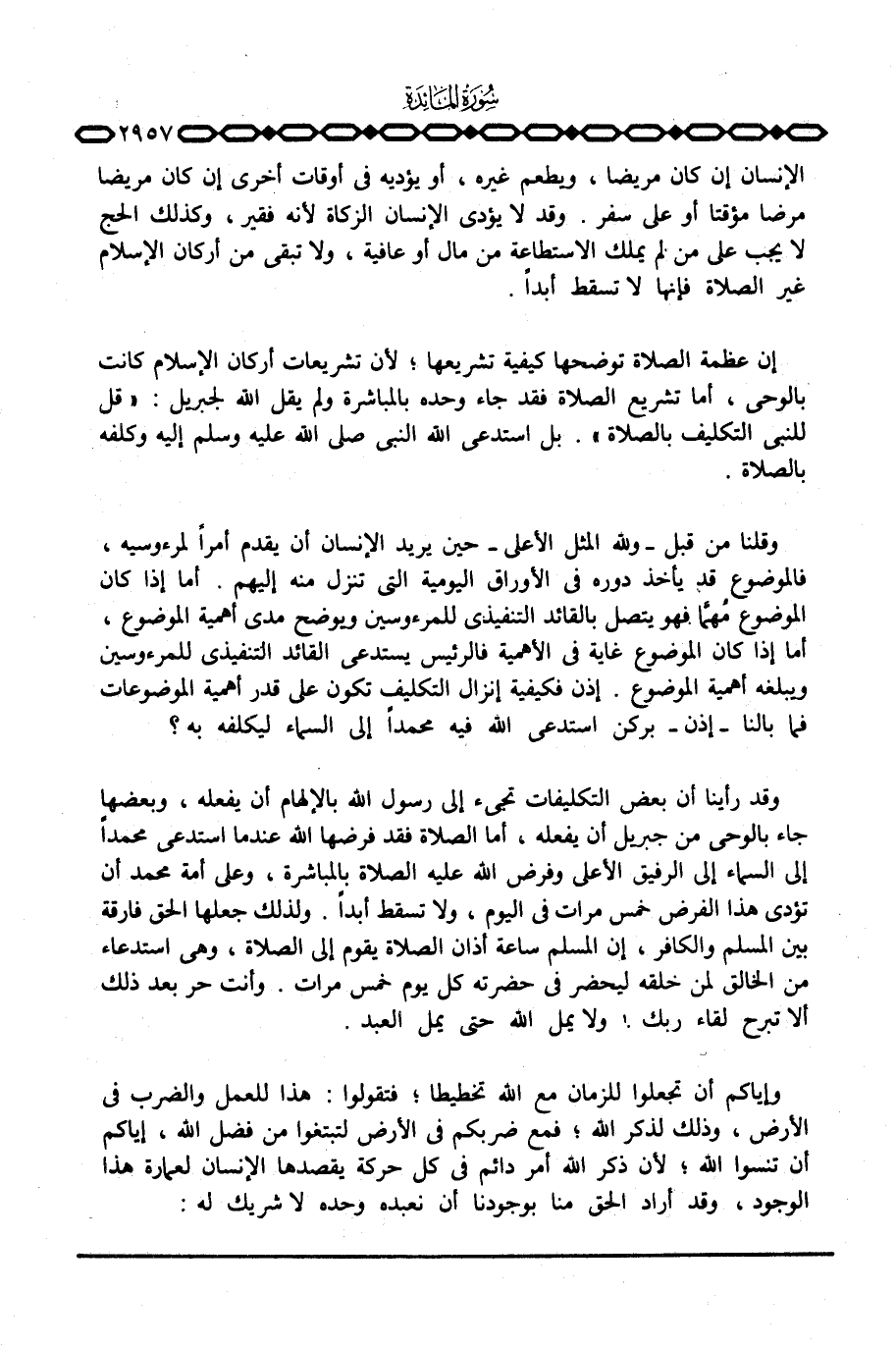 وقد رأينا أن بعض التكليفات تجيء إلى رسول الله بالإلهام أن يفعله، وبعضها جاء بالوحي من جبريل أن يفعله، أما الصلاة فقد فرضها الله عندما استدعى محمداً إلى السماء إلى الرفيق الأعلى وفرض الله عليه الصلاة بالمباشرة، وعلى أمة محمد أن تؤدي هذا الفرض خمس مرات في اليوم، ولا تسقط أبداً. ولذلك جعلها الحق فارقة بين المسلم والكافر، إن المسلم ساعة أذان الصلاة يقوم إلى الصلاة، وهي استدعاء من الخالق لمن خلقه ليحضر في حضرته كل يوم خمس مرات. وأنت حر بعد ذلك ألا تبرح لقاء ربك؛ ولا يمل الله حتى يمل العبد.