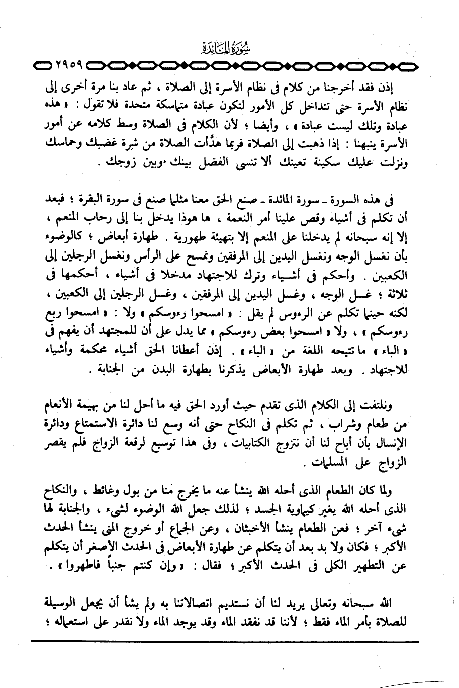 في هذه السورة - سورة المائدة - صنع الحق معنا مثلما صنع في سورة البقرة؛ فبعد أن تكلم في أشياء وقص علينا أمر النعمة، ها هوذا يدخل بنا إلى رحاب المنعم، إلا إنه سبحانه لم يدخلنا على المنعم إلا بتهيئة طهورية. طهارة أبعاض؛ كالوضوء بأن نغسل الوجه ونغسل اليدين إلى المرفقين ونمسح على الرأس ونغسل الرجلين إلى الكعبين. وأحكم في أشياء وترك للاجتهاد مدخلا في أشياء، أحكمها في ثلاثة؛ غسل الوجه، وغسل اليدين إلى المرفقين، وغسل الرجلين إلى الكعبين، لكنه حينما تكلم عن الرءوس لم يقل: «امسحوا رءوسكم» ولا: «امسحوا ربع رءوسكم» ، ولا «امسحوا بعض رءوسكم» مما يدل على أن للمجتهد أن يفهم في «الباء» ما تُتيحهُ اللغة من «الباء» . إذن أعطانا الحق أشياء محكمة وأشياء للاجتهاد. وبعد طهارة الأبعاض يذكرنا بطهارة البدن من الجنابة.