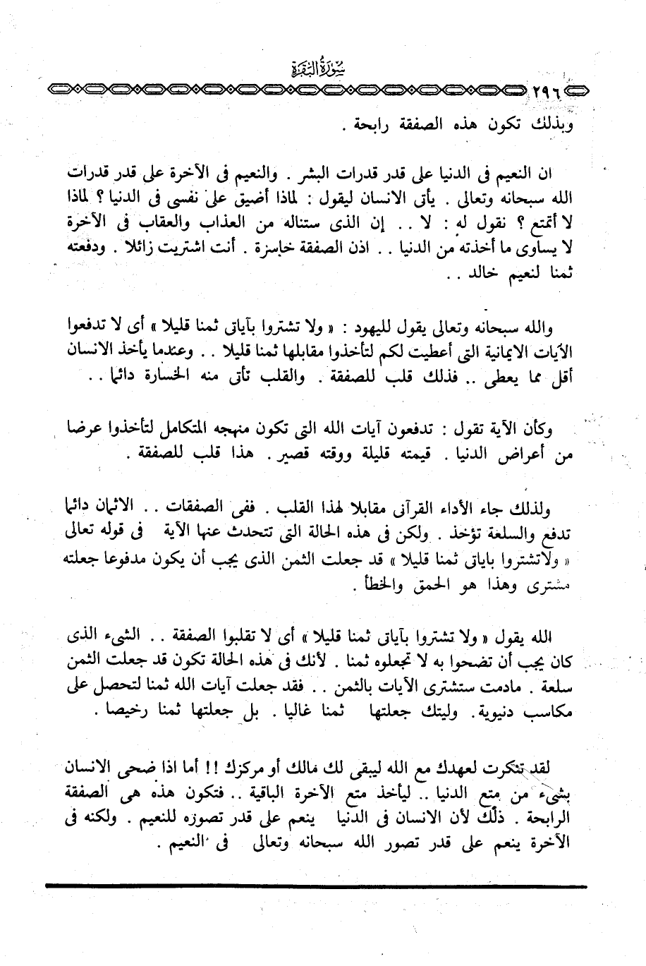الله يقول {وَلاَ تَشْتَرُواْ بِآيَاتِي ثَمَناً قَلِيلاً} أي لا تقبلوا الصفقة. . الشيء الذي كان يجب أن تضحوا به لا تجعلوه ثمنا. لأنك في هذه الحالة تكون قد جعلت الثمن سلعة. مادمت ستشتري الآيات بالثمن. . فقد جعلت آيات الله ثمنا لتحصل على مكاسب دنيوية. وليتك جعلتها ثمنا غاليا. بل جعلتها ثمنا رخيصا.