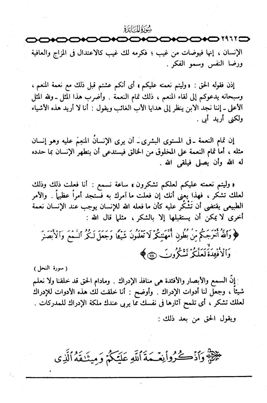 إن تمام النعمة - في المستوى البشري - أن يرى الإنسانُ المنعِمَ عليه وهو إنسان مثله، أما تمام النعمة على المخلوق من الخالق فيستدعي أن يتطهر الإنسان بما حدده له الله وأن يصلي فيلقى الله.