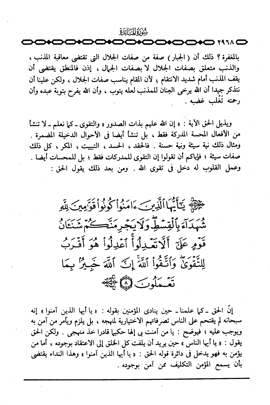 ويذيل الحق الآية: {إِنَّ الله عَلِيمٌ بِذَاتِ الصدور} والتقوى - كما نعلم - لا تنشأ من الأفعال المحسة المدركة فقط، بل تنشأ أيضا في الأحوال الدخيلة المضمرة. ومثال ذلك نية سيئة ونية حسنة. فالحقد، الحسد، التبييت، المكر، كل ذلك صفات سيئة؛ فإياكم أن تقولوا إن التقوى للمدركات فقط؛ بل للمحسات أيضا. وعمل القلوب له دخل في تقوى الله. ومن بعد ذلك يقول الحق: {يَا أَيُّهَآ الذين آمَنُواْ ... }