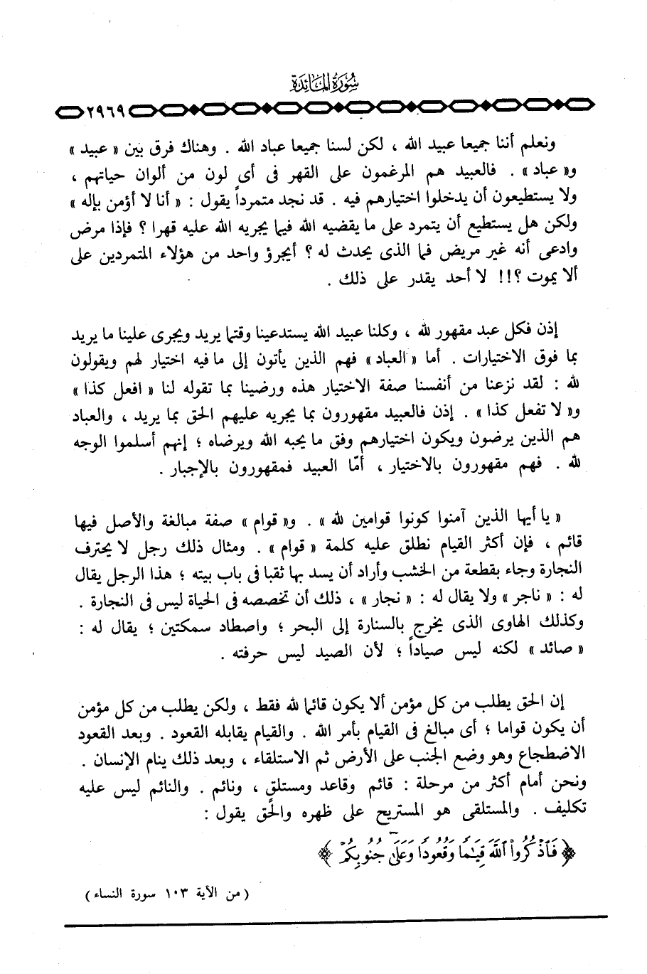 {يَا أَيُّهَآ الذين آمَنُواْ كُونُواْ قَوَّامِينَ للَّهِ} . و «قوام» صفة مبالغة والأصل فيها قائم، فإن أكثر القيام نطلق عليه «قوام» . ومثال ذلك رجل لا يحترف النجارة وجاء بقطعة من الخشب وأراد أن يسد بها ثقبا في باب بيته؛ هذا الرجل يقال له: «ناجر» ولا يقال له: «نجار» ، ذلك أن تخصصه في الحياة ليس في النجارة. وكذلك الهاوي الذي يخرج بالسنارة إلى البحر؛ واصطاد سمكتين؛ يقال له: «صائد» لكنه ليس صياداً؛ لأن الصيد ليس حرفته.