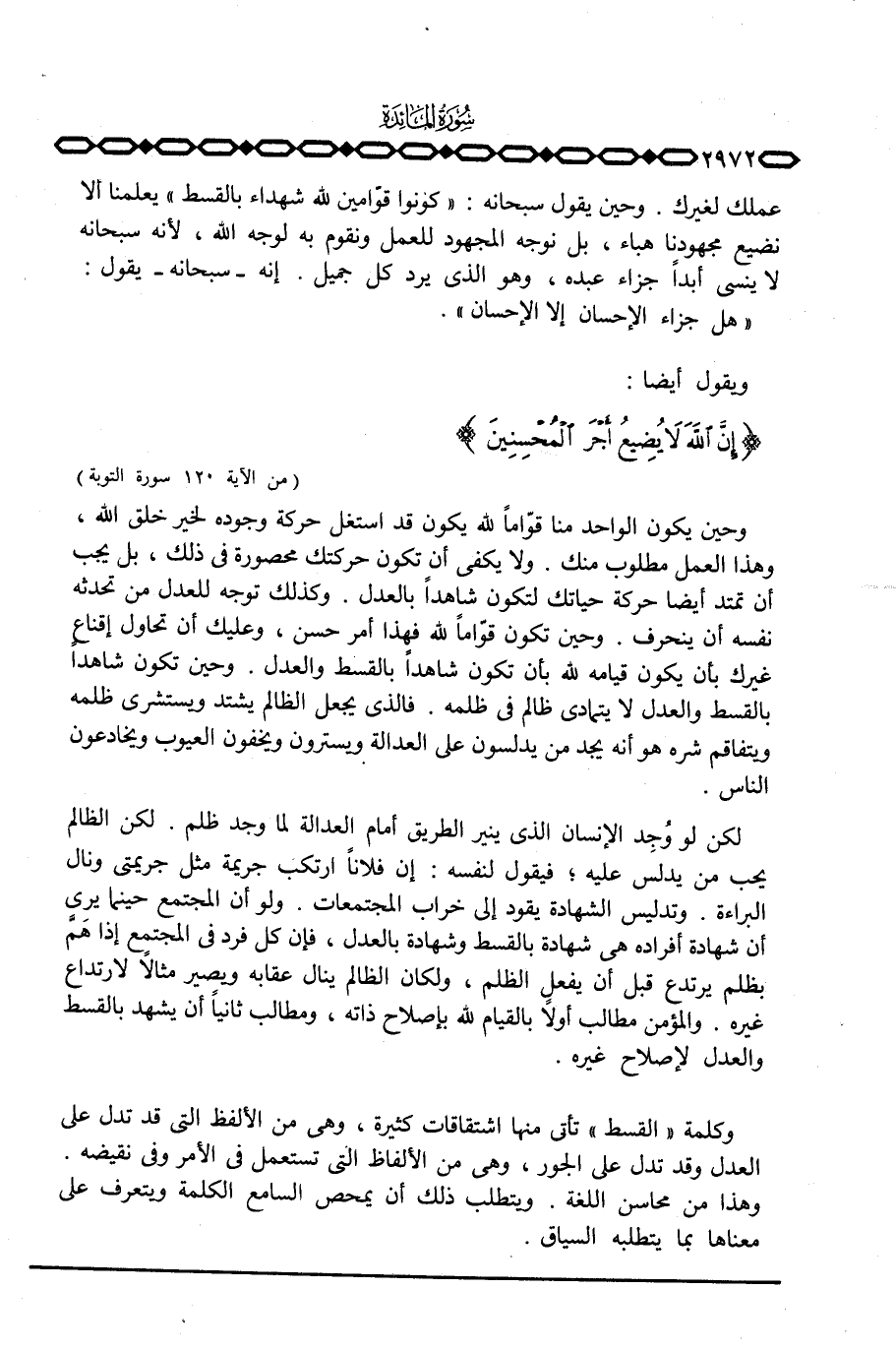 وحين يكون الواحد منا قوّاماً لله يكون قد استغل حركة وجوده لخير خلق الله، وهذا العمل مطلوب منك. ولا يكفي أن تكون حركتك محصورة في ذلك، بل يجب أن تمتد أيضاً حركة حياتك لتكون شاهداً بالعدل. وكذلك توجه للعدل من تحدثه نفسه أن ينحرف. وحين تكون قوّاماً لله فهذا أمر حسن، وعليك أن تحاول إقناع غيرك بأن يكون قيامه لله بأن تكون شاهداً بالقسط والعدل. وحين تكون شاهداً بالقسط والعدل لا يتمادى ظالم في ظلمه. فالذي يجعل الظالم يشتد ويستشري ظلمه ويتفاقم شره هو أنه يجد من يدلسون على العدالة ويسترون ويخفون العيوب ويخادعون الناس.
