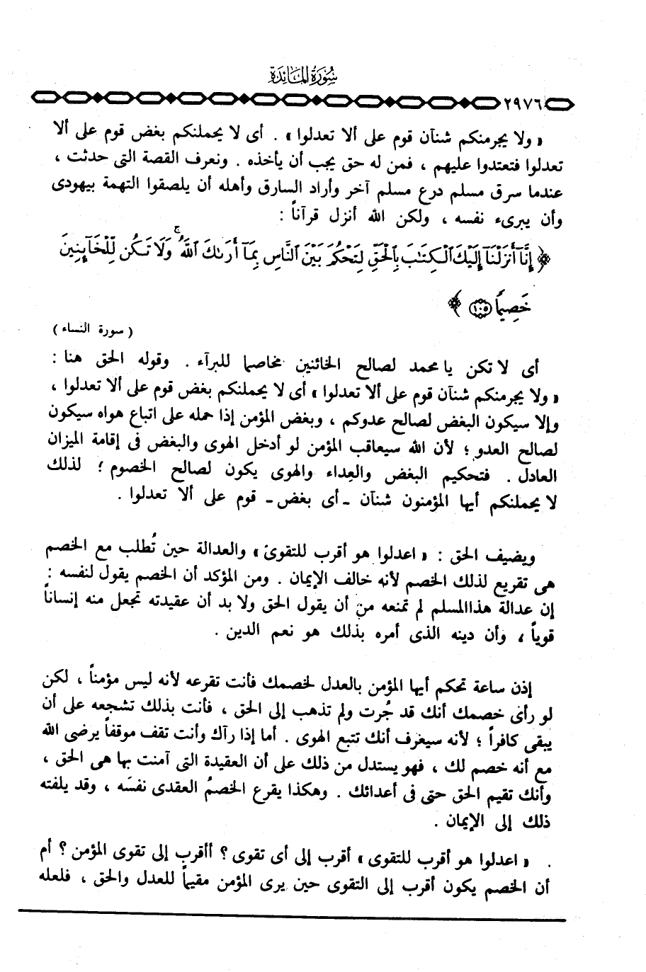 {وَلاَ يَجْرِمَنَّكُمْ شَنَآنُ قَوْمٍ على أَلاَّ تَعْدِلُواْ} . أي لا يحملنكم بغض قوم على ألا تعدلوا فتعتدوا عليهم، فمن له حق يجب أن يأخذه. ونعرف القصة التي حدثت، عندما سرق مسلم درع مسلم آخر وأراد السارق وأهله أن يلصقوا التهمة بيهودي وأن يبرئ نفسه، ولكن الله أنزل قرآناً: {إِنَّآ أَنْزَلْنَا إِلَيْكَ الكتاب بالحق لِتَحْكُمَ بَيْنَ الناس بِمَآ أَرَاكَ الله وَلاَ تَكُنْ لِّلْخَآئِنِينَ خَصِيماً} [النساء: 105]