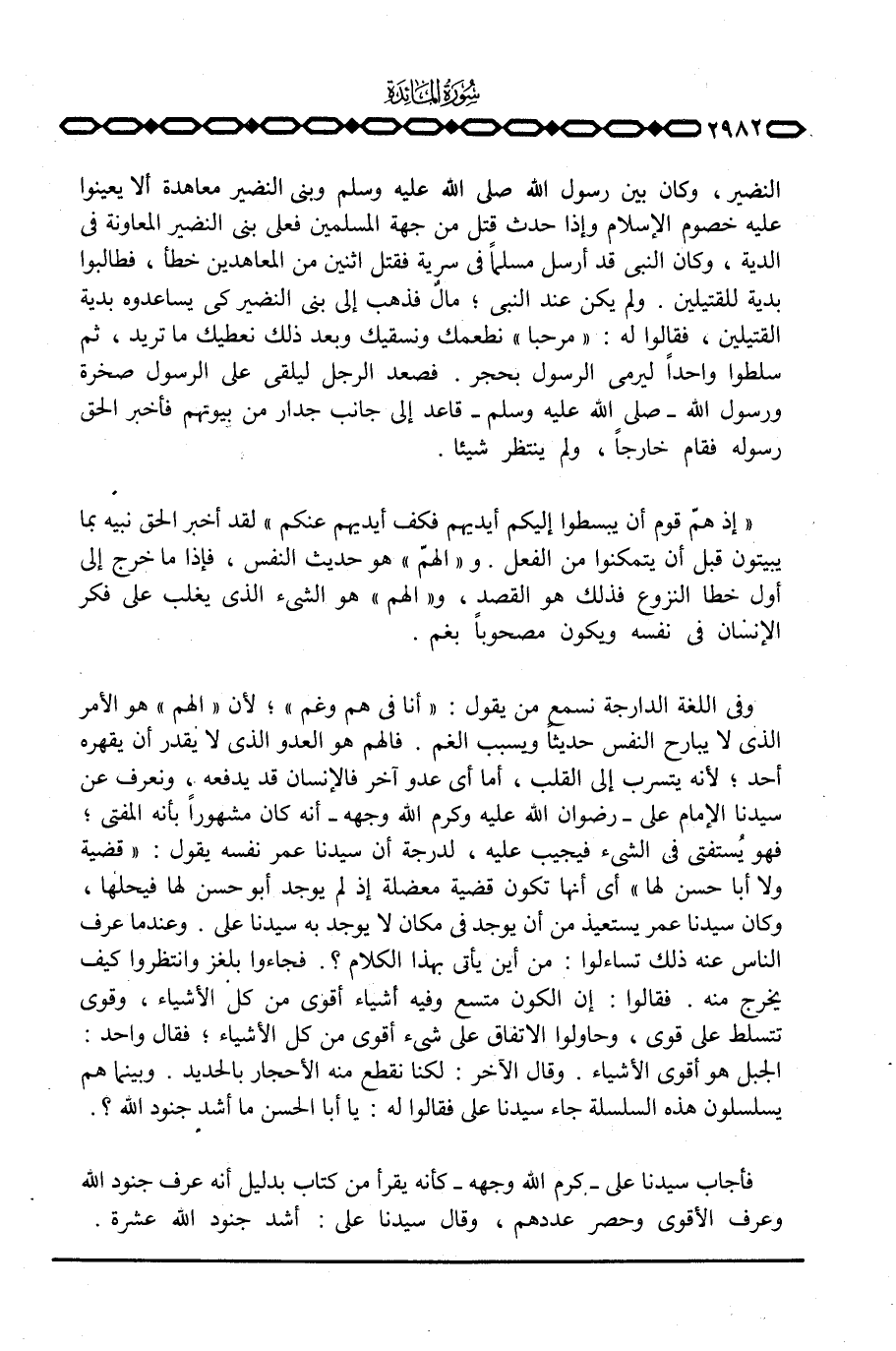 وفي اللغة الدارجة نسمع من يقول: «أنا في هم وغم» ؛ لأن «الهم» هو الأمر الذي لا يبارح النفس حديثاً ويسبب الغم. فالهم هو العدو الذي لا يقدر أن يقهره أحد؛ لأنه يتسرب إلى القلب، أما أي عدو آخر فالإنسان قد يدفعه، ونعرف عن سيدنا الإمام علي - رضوان الله عليه وكرم الله وجهه - أنه كان مشهوراً بأنه المفتي؛ فهو يُستفتى في الشيء فيجيب عليه، لدرجة أن سيدنا عمر نفسه يقول: «قضية ولا أبا حسن لها» أي أنها تكون قضية معضلة إذ لم يوجد أبو حسن لها فيحلها، وكان سيدنا عمر يستعيذ من أن يوجد في مكان لا يوجد به سيدنا علي. وعندما عرف الناس عنه ذلك تساءلوا: من أين يأتي بهذا الكلام؟ . فجاءوا بلغز وانتظروا كيف يخرج منه. فقالوا: إن الكون متسع وفيه أشياء أقوى من كل الأشياء، وقوى تتسلط على قوى، وحاولوا الاتفاق على شيء اقوى من كل الأشياء؛ فقال واحد: الجبل هو أقوى الأشياء. وقال الآخر: لكنا نقطع منه الأحجار بالحديد. وبينما هم يسلسلون هذه السلسلة جاء سيدنا علي فقالوا له: يا أبا الحسن ما أشد جنود الله؟ .