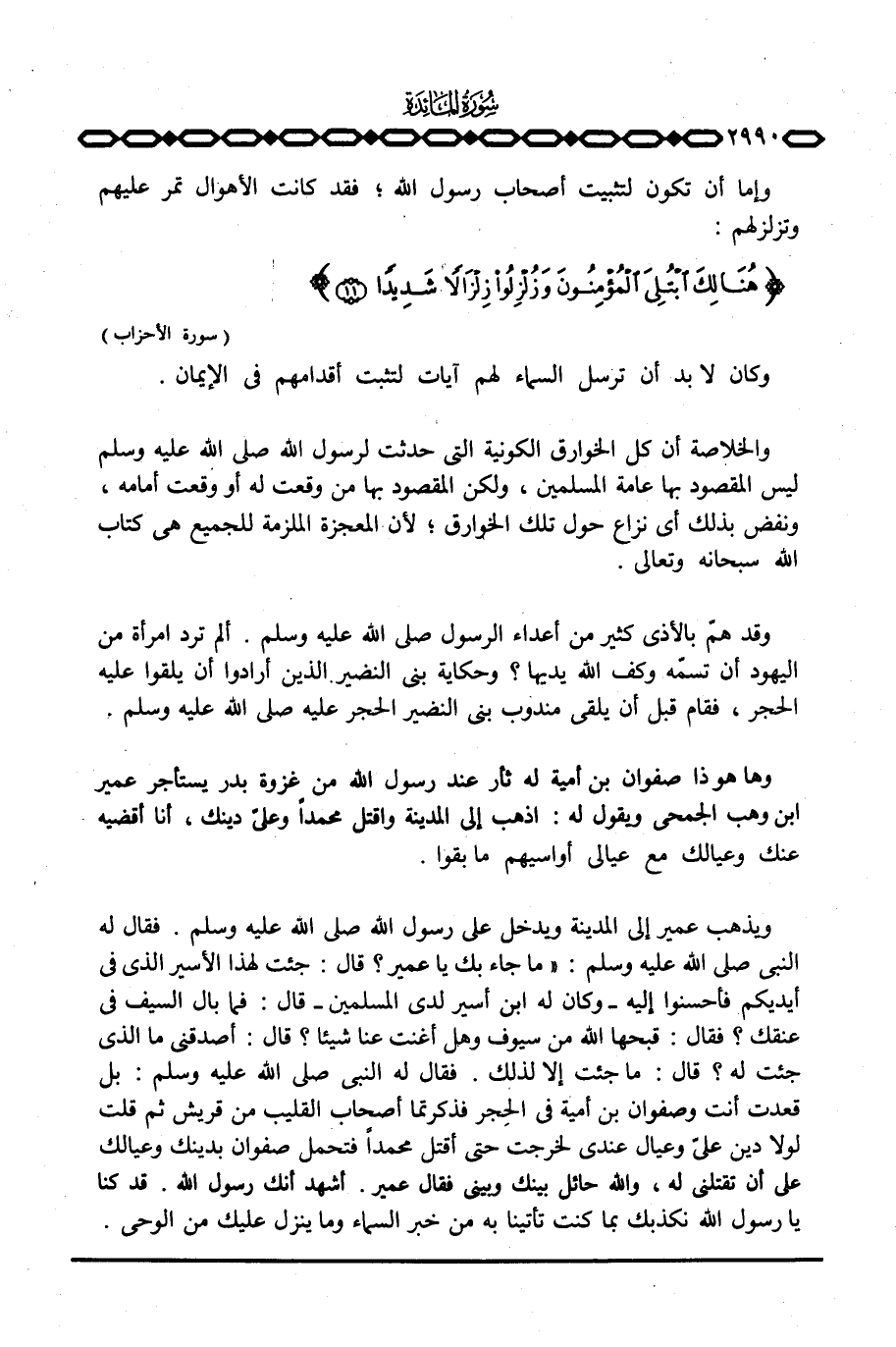 «وها هوذا صفوان بن أمية له ثأر عند رسول الله من غزوة بدر يستأجر عمير ابن وهب الجمحي ويقول له: اذهب إلى المدينة واقتل محمداً وعليّ دينك، أنا أقضيه عنك وعيالك مع عيالي أواسيهم ما بقوا.