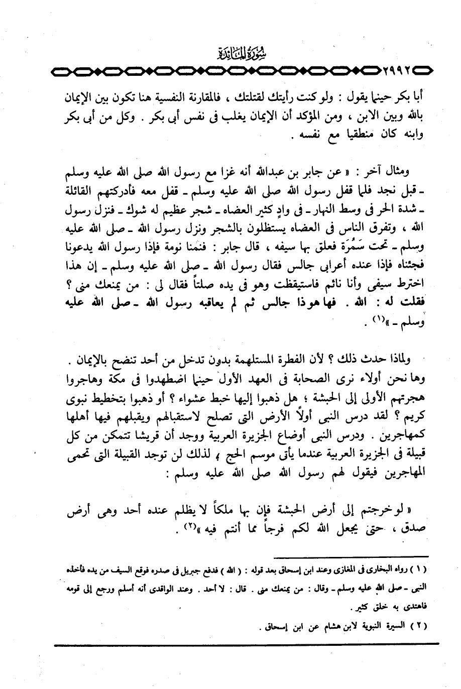 ومثال آخر: «عن جابر بن عبد الله أنه غزا مع رسول الله صَلَّى اللَّهُ عَلَيْهِ وَسَلَّم َ - قبل نجد فلما قفل رسول الله صَلَّى اللَّهُ عَلَيْهِ وَسَلَّم َ - قفل معه فأدركتهم القائلة - شدة الحر في وسط النهار - في وادٍ كثير العضاة - شجر عظيم له شوك - فنزل رسول الله، وتفرق الناس في العضاة يستظلون بالشجر ونزل رسول الله - صَلَّى اللَّهُ عَلَيْهِ وَسَلَّم َ - تحت سَمُرَة فعلق بها سيفه، قال جابر: فنمنا نومة فإذا رسول الله يدعونا فجئناه فإذا عنده أعرابي جالس فقال رسول الله - صَلَّى اللَّهُ عَلَيْهِ وَسَلَّم َ - إن هذا اخترط سيفي وأنا نائم فاستيقظت وهو في يده صلتاً فقال لي: من يمنعك مني؟ فقلت له: الله. فها هوذا جالس ثم لم يعاقبه رسول الله - صَلَّى اللَّهُ عَلَيْهِ وَسَلَّم َ