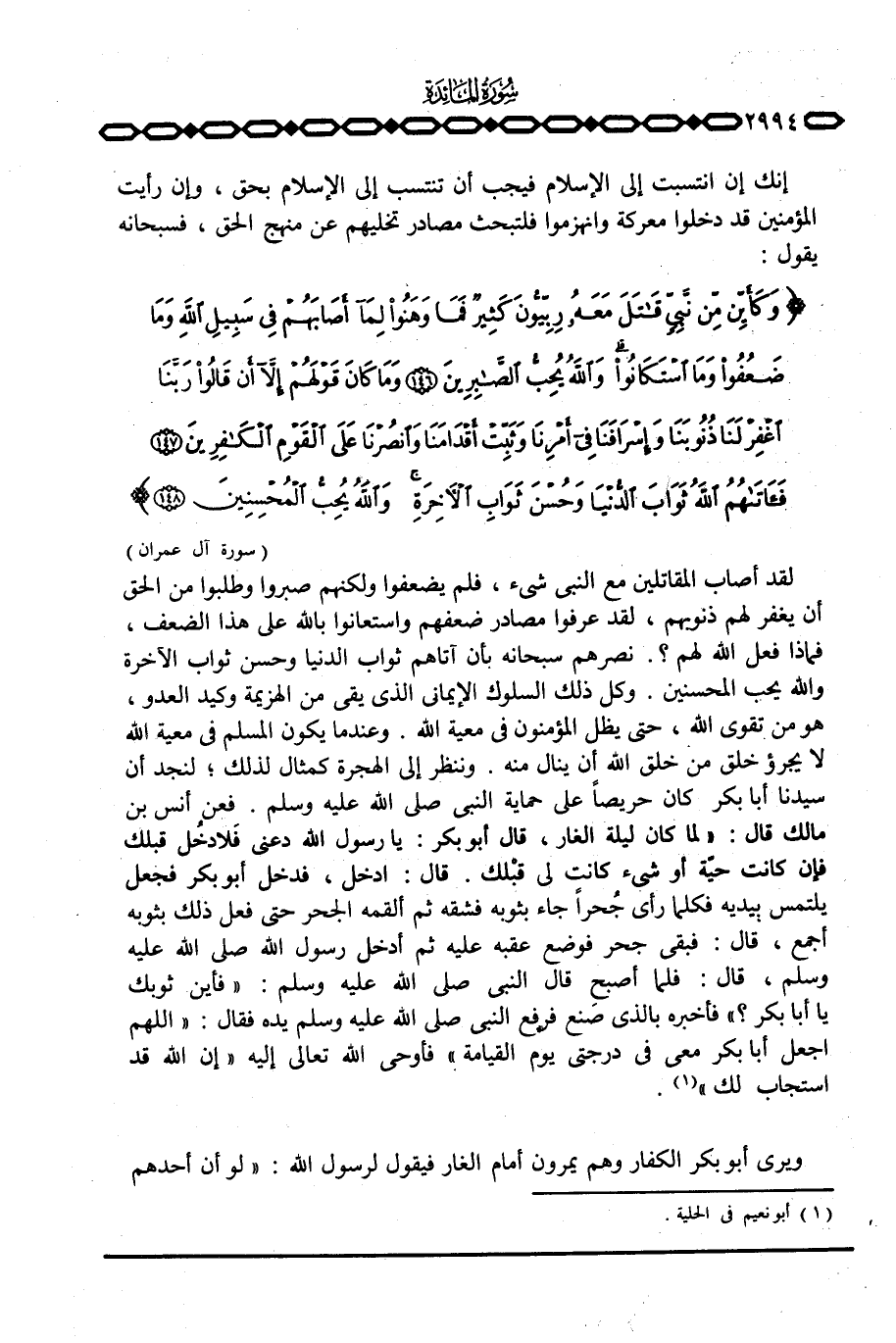 إنك إن انتسبت إلى الإسلام فيجب أن تنتسب إلى الإسلام بحق، وإن رأيت المؤمنين قد دخلوا معركة وانهزموا فلتبحث مصادر تخليهم عن منهج الحق، فسبحانه يقول: {وَكَأَيِّن مِّن نَّبِيٍّ قَاتَلَ مَعَهُ رِبِّيُّونَ كَثِيرٌ فَمَا وَهَنُواْ لِمَآ أَصَابَهُمْ فِي سَبِيلِ الله وَمَا ضَعُفُواْ وَمَا استكانوا والله يُحِبُّ الصابرين وَمَا كَانَ قَوْلَهُمْ إِلاَّ أَن قَالُواْ ربَّنَا اغفر لَنَا ذُنُوبَنَا وَإِسْرَافَنَا في أَمْرِنَا وَثَبِّتْ أَقْدَامَنَا وانصرنا عَلَى القوم الكافرين فَآتَاهُمُ الله ثَوَابَ الدنيا وَحُسْنَ ثَوَابِ الآخرة والله يُحِبُّ المحسنين} [آل عمران: 146 - 148]
