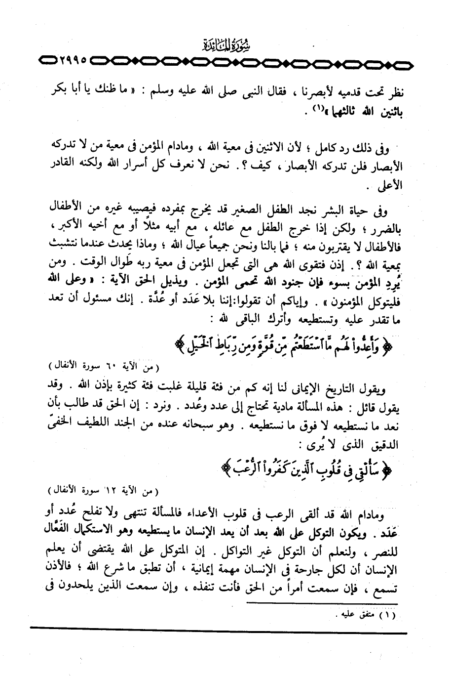 ومادام الله قد ألقى الرعب في قلوب الأعداء فالمسألة تنتهي ولا تفلح عُدد أو عَدَد. ويكون التوكل على الله بعد أن يعد الإنسان ما يستطيعه وهو الاستكمال الفَعَّال للنصر، ولنعلم أن التوكل غير التواكل. إن المتوكل على الله يقتضي أن يعلم الإنسان أن لكل جارحة في الإنسان مهمة إيمانية، أن تطبق ما شرع الله؛ فالأذن تسمع، فإن سمعت أمراً من الحق فأنت تنفذه، وإن سمعت الذين يلحدون في
