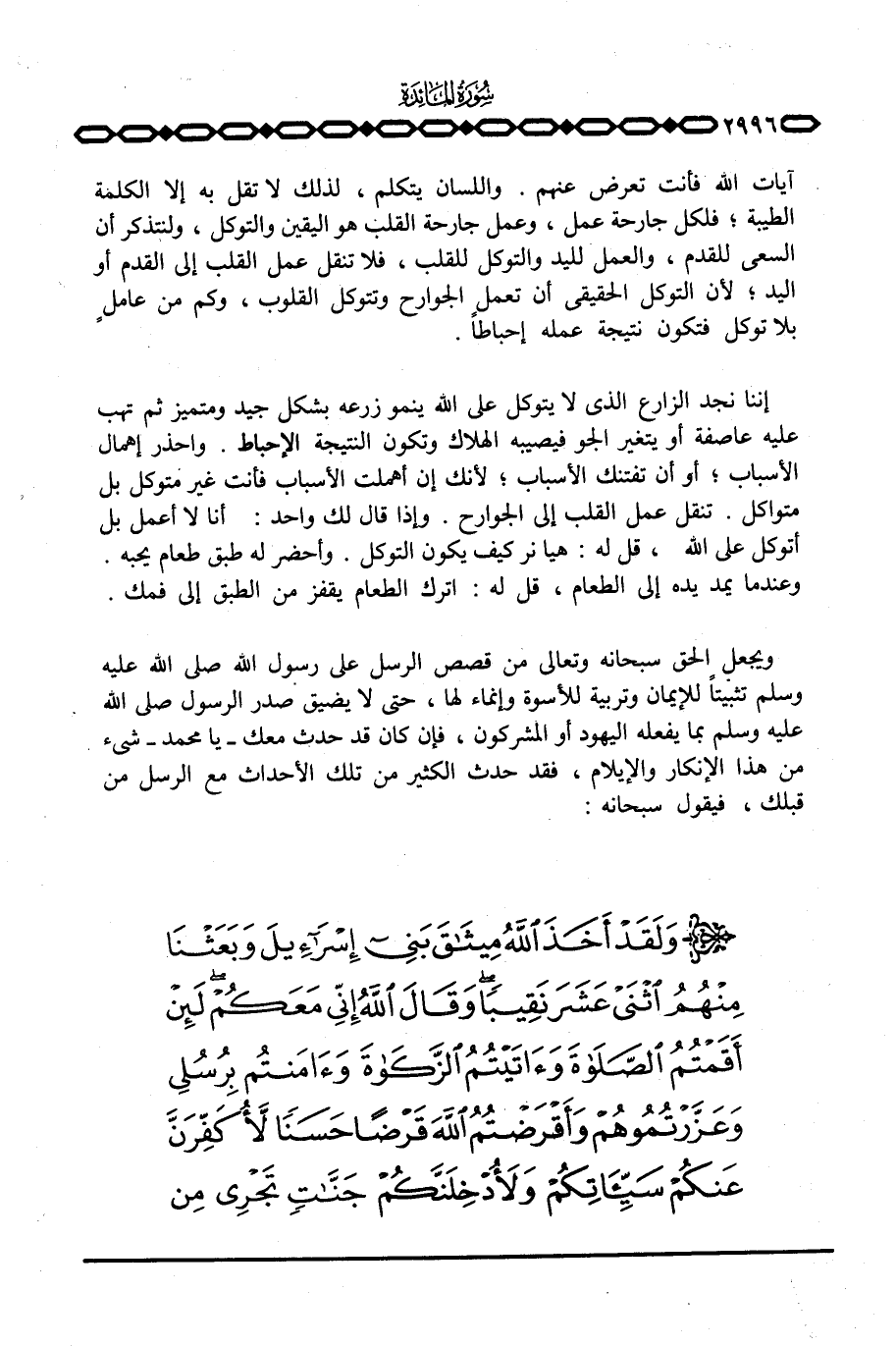 آيات الله فأنت تعرض عنهم. واللسان يتكلم، لذلك لا تقل به إلا الكلمة الطيبة؛ فلكل جارحة عمل، وعمل جارحة القلب هو اليقين والتوكل، ولنتذكر أن السعي للقدم، والعمل لليد والتوكل للقلب، فلا تنقل عمل القلب إلى القدم أو اليد؛ لأن التوكل الحقيقي أن تعمل الجوارح وتتوكل القلوب، وكم من عاملٍ بلا توكل فتكون نتيجة عمله إحباطاً.
