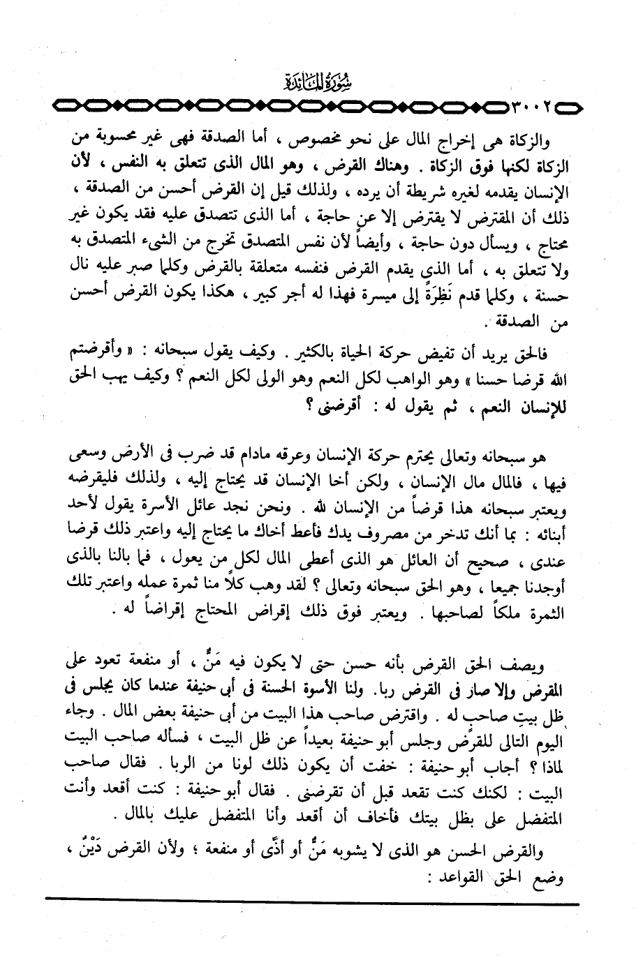 ويصف الحق القرض بأنه حسن حتى لا يكون فيه مَنُّ، أو منفعة تعود على المقرض وإلا صار في القرض ربا. ولنا الأسوة الحسنة في أبي حنيفة عندما يجلس في ظل بيتِ صاحبٍ له. واقترض صاحب هذا البيت من أبي حنيفة بعض المال. وجاء اليوم التالي للقرض وجلس ابو حنيفة بعيداً عن ظل البيت، فسأله صاحب البيت لماذا؟ أجاب أبو حنيفة: خفت أن يكون ذلك لونا من الربا.
