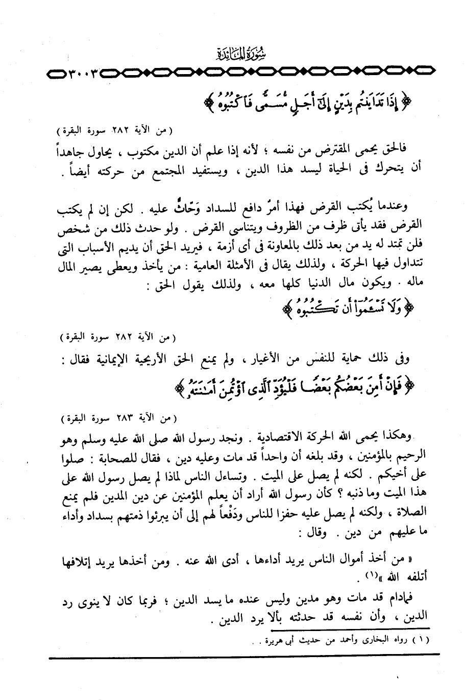 وهكذا يحمي الله الحركة الاقتصادية. ونجد رسول الله صَلَّى اللَّهُ عَلَيْهِ وَسَلَّم َ وهو الرحيم بالمؤمنين، وقد بلغه أن واحداً قد مات وعليه دين، فقال للصحابة: صلوا على أخيكم. لكنه لم يصل على الميت. وتساءل الناس لماذا لم يصل رسول الله على هذا الميت وما ذنبه؟ كأن رسول الله أراد أن يعلم المؤمنين عن دين المدين فلم يمنع الصلاة، ولكنه لم يصل عليه حفزا للناس ودَفْعاً لهم إلى أن يبرئوا ذمتهم بسداد وأداء ما عليهم من دين. وقال: