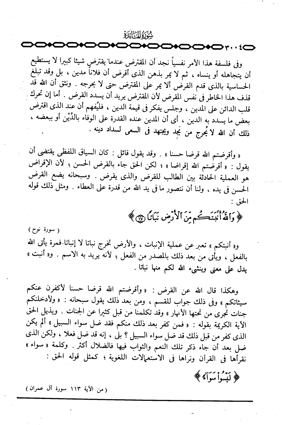 وهكذا قال الله عن القرض: {وَأَقْرَضْتُمُ الله قَرْضاً حَسَناً لأُكَفِّرَنَّ عَنْكُمْ سَيِّئَاتِكُمْ} وفي ذلك جواب للقسم، ومن بعد ذلك يقول سبحانه: {وَلأُدْخِلَنَّكُمْ جَنَّاتٍ تَجْرِي مِن تَحْتِهَا الأنهار} وقد تكلمنا من قبل كثيرا عن الجنات. ويذيل الحق الآية الكريمة بقوله: {فَمَن كَفَرَ بَعْدَ ذلك مِنْكُمْ فَقَدْ ضَلَّ سَوَآءَ السبيل} ألم يكن الذي كفر من قبل ذلك قد ضل سواء السبيل؟ بلى، إنه قد ضل فعلا، ولكن الذي ضل بعد أن جاء ذكر تلك النعم والثواب فيها فالضلال أكثر. وكلمة «سواء» نقرأها في القرآن ونراها في الاستعمالات اللغوية؛ كمثل قوله الحق: {لَيْسُواْ سَوَآءً} [آل عمران: 113]