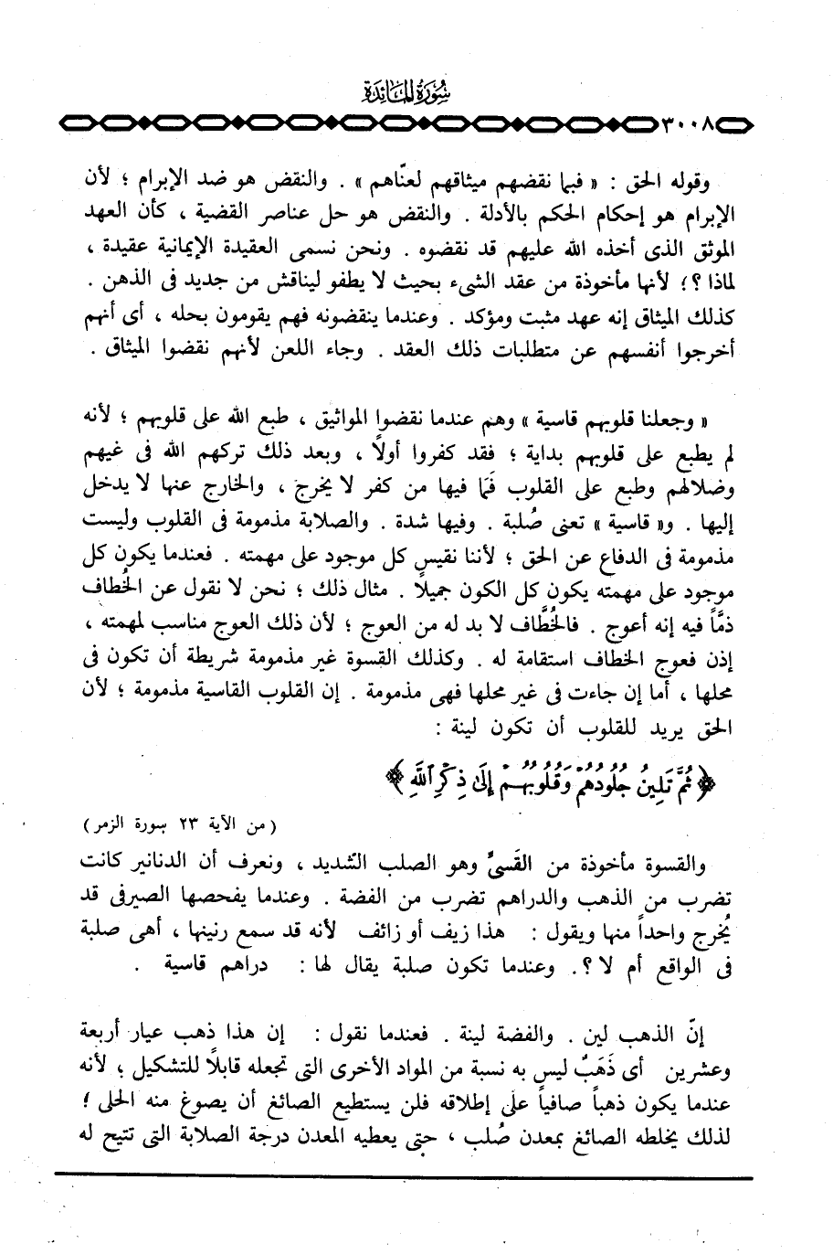 {وَجَعَلْنَا قُلُوبَهُمْ قَاسِيَةً} وهم عندما نقضوا المواثيق، طبع الله على قلوبهم؛ لأنه لم يطبع على قلوبهم بداية؛ فقد كفروا أولاً، وبعدذ لك تركهم الله في غيهم وضلالهم وطبع على القلوب فَمَا فيها من كفر لايخرج، والخارج عنها لا يدخل إليها. و «قاسية» تعني صُلبة. وفيها شدة. والصلابة مذمومة في القلوب وليست مذمومة في الدفاع عن الحق؛ لأننا نقيس كل موجود على مهمته. فعندما يكون كل موجود على مهمته يكون كل الكون جميلاً. مثال ذلك؛ نحن لا نقول عن الخُطاف ذمَّاً فيه إنه أعوج. فالخُطَّاف لا بد له من العوج؛ لأن ذلك العوج مناسب لمهمته، إذن فعوج الخطاف استقامة له. وكذلك القسوة غير مذمومة شريطة أن تكون في محلها، أما إن جاءت في غير محلها فهي مذمومة. إن القلوب القاسية مذمومة؛ لأن الحق يريد للقلوب أن تكون لينة: {ثُمَّ تَلِينُ جُلُودُهُمْ وَقُلُوبُهُمْ إلى ذِكْرِ الله} [الزمر: 23]