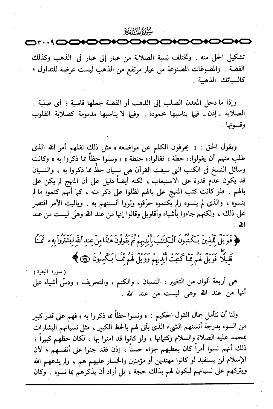 ويقول الحق: {يُحَرِّفُونَ الكلم عَن مَّوَاضِعِهِ} مثل ذلك نقلهم أمر الله الذي طلب منهم أن يقولوا: «حطة» فقالوا: «حنطة» {وَنَسُواْ حَظًّا مِّمَّا ذُكِرُواْ بِهِ} وكانت وسائل النسخ في الكتب التي سبقت القرآن هي نسيان حظٍّ مما ذكروا به، والنسيان قد يكون عدم قدرة على الاستيعاب، لكنه أيضاً دليل على أن المنهج لم يكن على بالهم. فلو كانت كتب المنهج على بالهم لظلوا على ذكر منه، كما أنهم كتموا ما لم ينسوه، والذي لم ينسوه ولم يكتموه حرّفوه ولووا ألسنتهم به. وياليت الأمر اقتصر على ذلك، ولكنهم جاءوا بأشياء وأقاويل وقالوا إنها من عند الله وهي ليست من عند الله: {فَوَيْلٌ لِّلَّذِينَ يَكْتُبُونَ الكتاب بِأَيْدِيهِمْ ثُمَّ يَقُولُونَ هذا مِنْ عِنْدِ الله لِيَشْتَرُواْ بِهِ ثَمَناً قَلِيلاً فَوَيْلٌ لَّهُمْ مِّمَّا كَتَبَتْ أَيْدِيهِمْ وَوَيْلٌ لَّهُمْ مِّمَّا يَكْسِبُونَ} [البقرة: 79]
