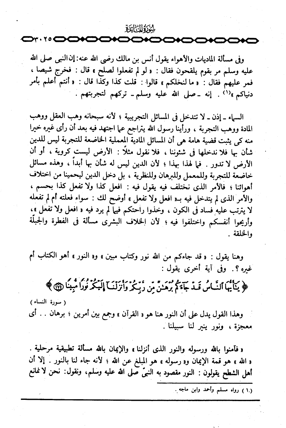 وهذا القول يدل على أن النور هنا هو «القرآن» وجمع بين أمرين؛ برهان. . أي معجزة، ونور ينير لنا سبيلنا.