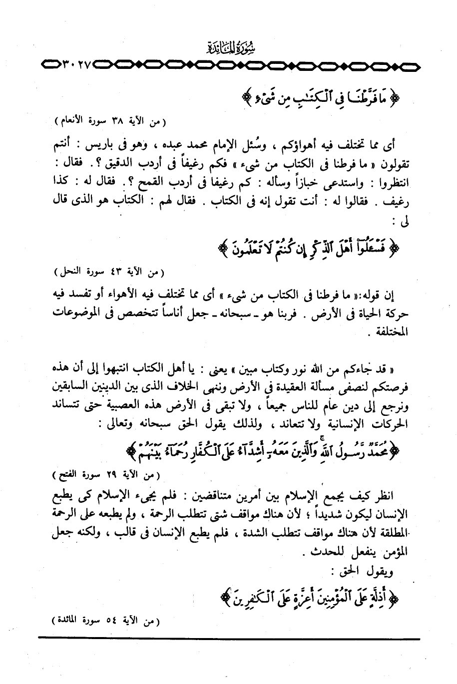 أي مما تختلف فيه أهواؤكم. وسُئل الإمام محمد عبده، وهو في باريس: أنتم تقولون {مَّا فَرَّطْنَا فِي الكتاب مِن شَيْءٍ} فكم رغيفاً في أردب الدقيق؟ . فقال: انتظروا: واستدعى خبازاً وسأله: كم رغيفا في أردب القمح؟ . فقال له: كذا رغيف. فقالوا له: أنت تقول إنه في الكتاب. فقال لهم: الكتاب هو الذي قال لي: {فاسألوا أَهْلَ الذكر إِن كُنْتُم لاَ تَعْلَمُونَ} [النحل: 43]