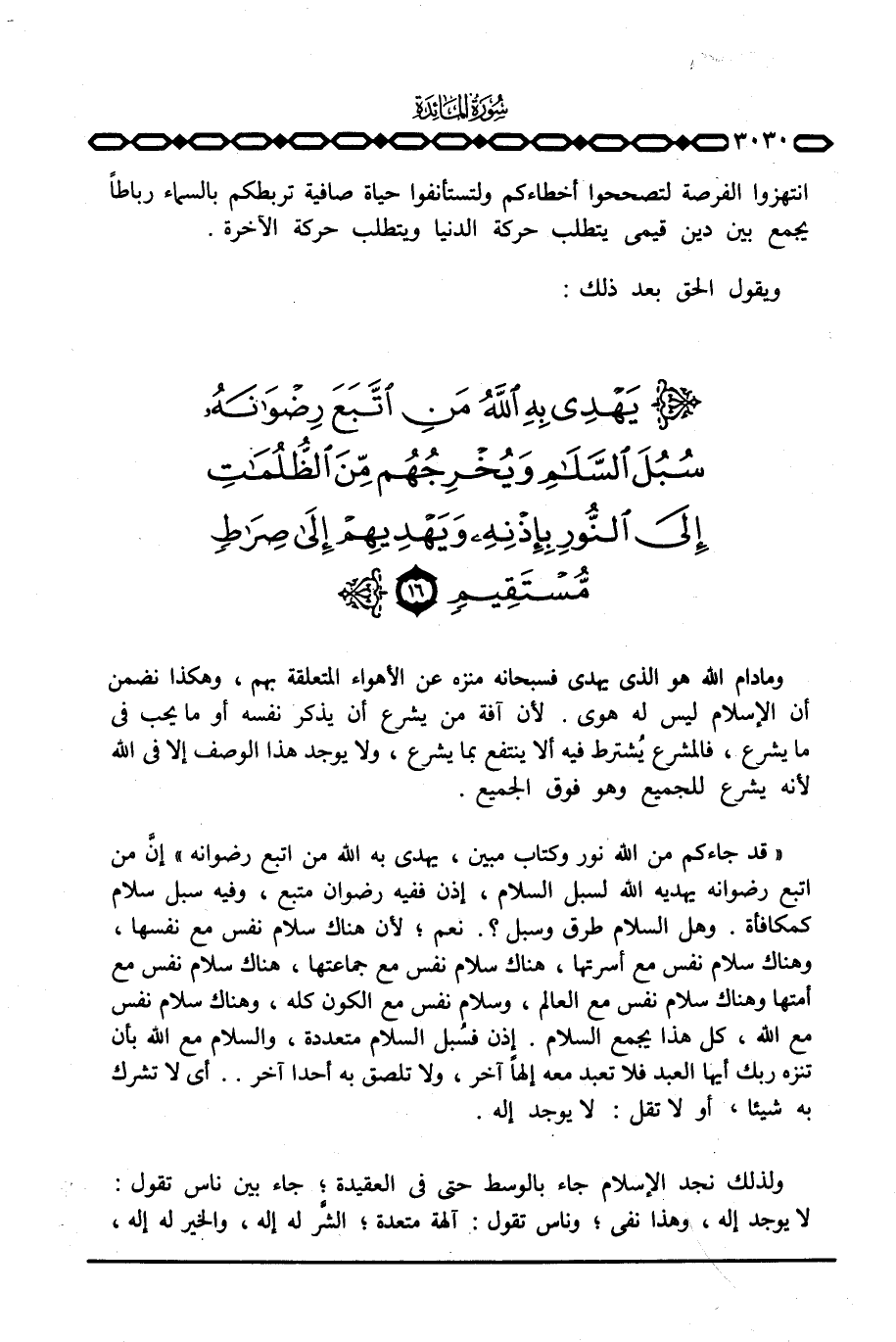 {قَدْ جَآءَكُمْ مِّنَ الله نُورٌ وَكِتَابٌ مُّبِينٌ، يَهْدِي بِهِ الله مَنِ اتبع رِضْوَانَهُ} إنَّ من اتبع رضوانه يهديه الله لسبل السلام، إذن ففيه رضوان متبع، وفيه سبل سلام كمكافأة. وهل السلام طرق وسبل؟ . نعم؛ لأن هناك سلام نفس مع نفسها، وهناك سلام نفس مع أسرتها، هناك سلام نفس مع جماعتها، هناك سلا نفس مع أمتها وهناك سلام نفس مع العالم، وسلام نفس مع الكون كله، وهناك سلام نفس مع الله، كل هذا يجمع السلام. إذن فسُبل السلام متعددة، والسلام مع الله بأن تنزه ربك أيها العبد فلا تعبد معه إلهاً آخر، ولا تلصق به أحدا آخر. . أي لا تشرك به شيئا، أو لا تقل: لايوجد إله.