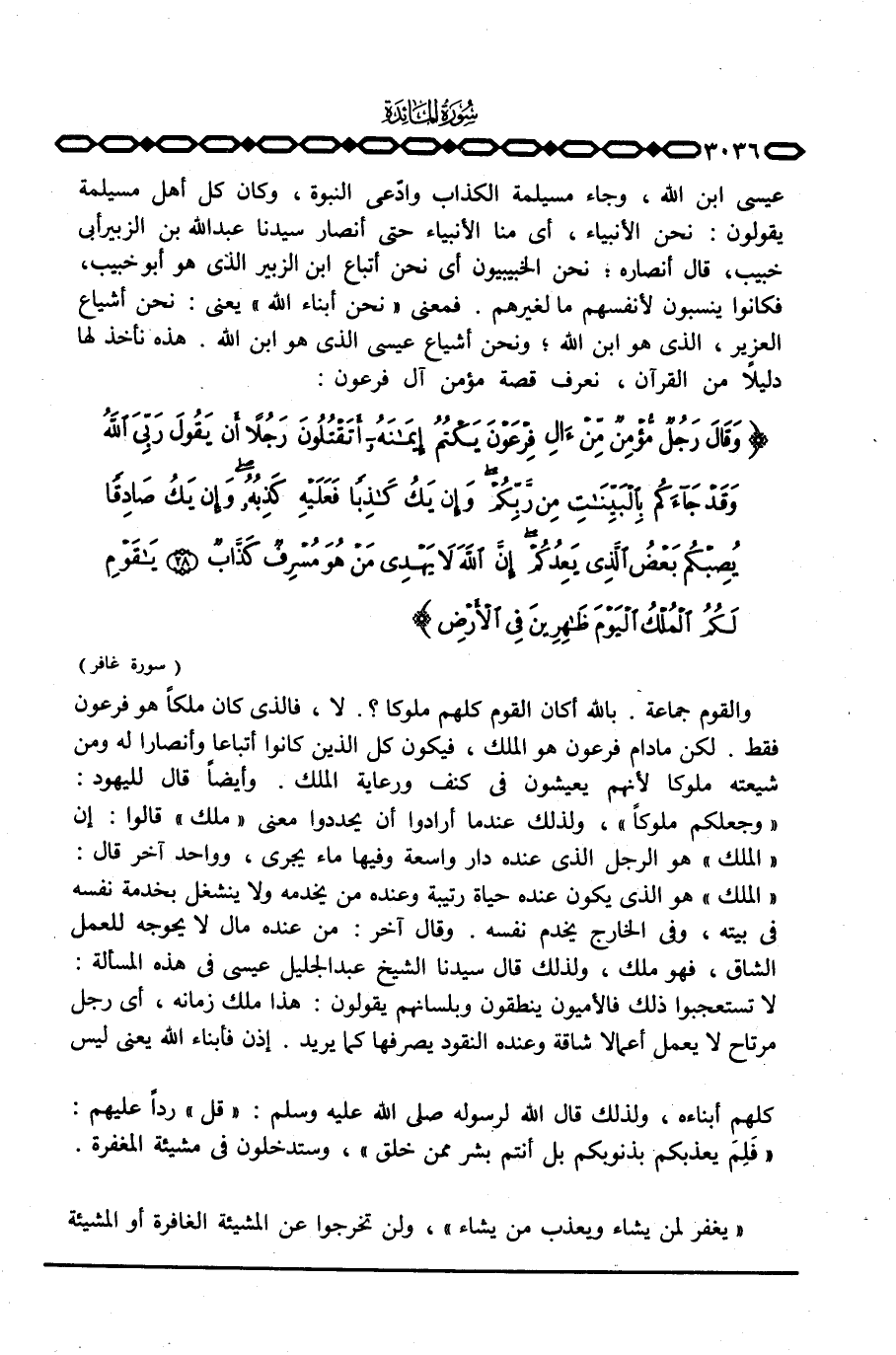 عيسى ابن الله، وجاء مسيلمة الكذاب وادّعى النبوة، وكان كل أهل مسيلمة يقولون: نحن الأنبياء، أي منا الأنبياء حتى أنصار سيدنا عبد الله بن الزبير أبي خبيب، قال أنصاره: نحن الخبيبيون أي نحن أتباع ابن الزبير الذي هو أبو خبيب، فكانوا ينسبون لأنفسهم ما لغيرهم. فمعنى {نَحْنُ أَبْنَاءُ الله} يعني: نحن أشياع العزير، الذي هو ابن الله؛ ونحن أشياع عيسى الذي هو ابن الله. هذه نأخذ لها دليلاً من القرآن، نعرف قصة مؤمن آل فرعون: {وَقَالَ رَجُلٌ مُّؤْمِنٌ مِّنْ آلِ فِرْعَوْنَ يَكْتُمُ إِيمَانَهُ أَتَقْتُلُونَ رَجُلاً أَن يَقُولَ رَبِّيَ الله وَقَدْ جَآءَكُمْ بالبينات مِن رَّبِّكُمْ وَإِن يَكُ كَاذِباً فَعَلَيْهِ كَذِبُهُ وَإِن يَكُ صَادِقاً يُصِبْكُمْ بَعْضُ الذي يَعِدُكُمْ إِنَّ الله لاَ يَهْدِي مَنْ هُوَ مُسْرِفٌ كَذَّابٌ ياقوم لَكُمُ الملك اليوم ظَاهِرِينَ فِي الأرض} [غافر: 28 - 29]