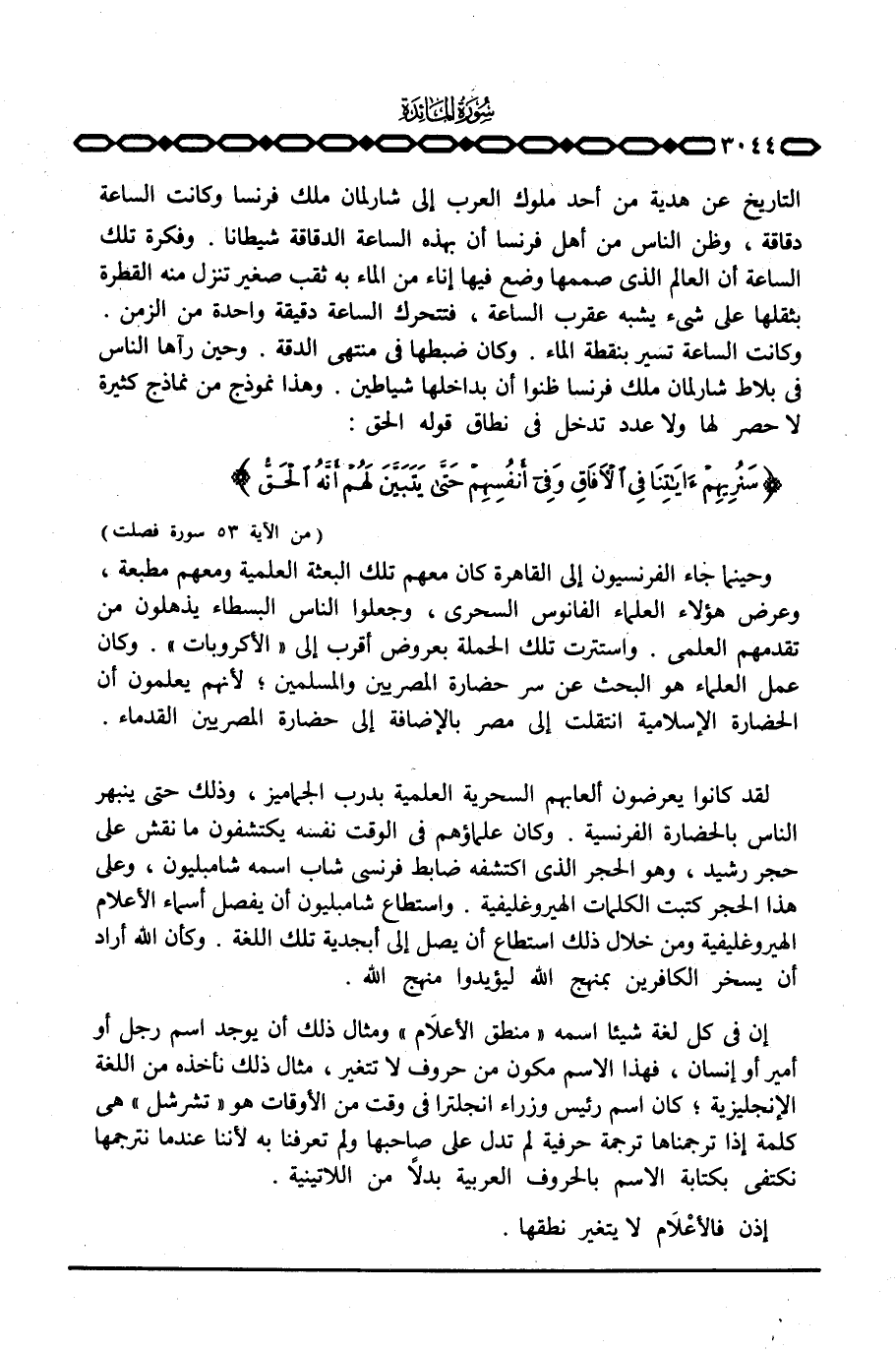 التاريخ عن هدية من أحد ملوك العرب إلى شارلمان ملك فرنسا وكانت الساعة دقاقة، وظن الناس من أهل فرنسا أن بهذه الساعة الدقاقة شيطانا. وفكرة تلك الساعة أن العالم الذي صممها وضع فيها إناء من الماء به ثقب صغير تنزل منه القطرة بثقلها على شيء يشبه عقرب الساعة، فتتحرك الساعة دقيقة واحدة من الزمن. وكانت الساعة تسير بنقطة الماء. وكان ضبطها في منتهى الدقة. وحين رآها الناس في بلاط شارلمان ملك فرنسا ظنوا أن بداخلها شياطين. وهذا نموذج من نماذج كثيرة لا حصر لها ولا عدد تدخل في نطاق قوله الحق: {سَنُرِيهِمْ آيَاتِنَا فِي الآفاق وفي أَنفُسِهِمْ حتى يَتَبَيَّنَ لَهُمْ أَنَّهُ الحق} [فصلت: 53]