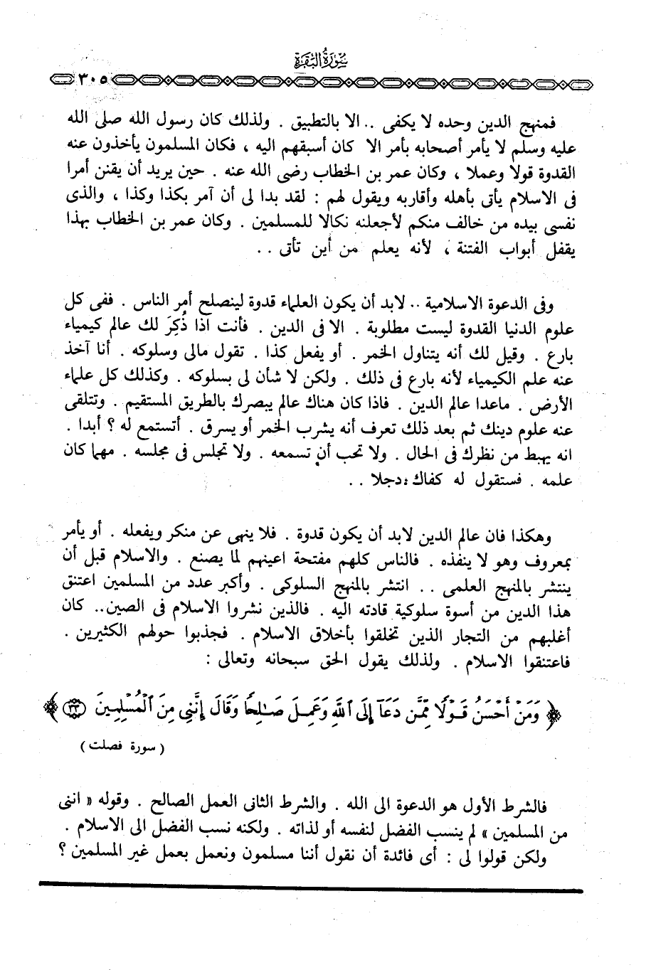 وهكذا فإن عالم الدين لابد أن يكون قدوة. فلا ينهى عن منكر ويفعله. أو يأمر بمعروف وهو لا ينفذه. فالناس كلهم مفتحة أعينهم لما يصنع. والإسلام قبل أن ينتشر بالمنهج العلمي. . انتشر بالمنهج السلوكي. وأكبر عدد من المسلمين اعتنق هذا الدين من أسوة سلوكية قادته إليه. فالذين نشروا الإسلام في الصين. . كان أغلبهم من التجار الذين تخلقوا بأخلاق الإسلام. فجذبوا حولهم الكثيرين. فاعتنقوا الإسلام. ولذلك يقول الحق سبحانه وتعالى: {وَمَنْ أَحْسَنُ قَوْلاً مِّمَّن دَعَآ إِلَى الله وَعَمِلَ صَالِحاً وَقَالَ إِنَّنِي مِنَ المسلمين} [فصلت: 33]