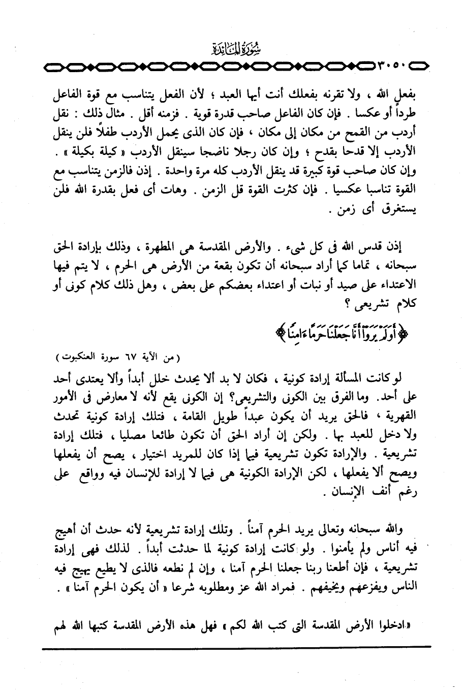 والله سبحانه وتعالى يريد الحرم آمنا. وتلك إرادة تشريعية لأنه حدث أن أهيج فيه أناس ولم يأمنوا. ولو كانت إرادة كونية لما حدثت أبداً. لذلك فهي إرادة تشريعية، فإن أطعنا ربنا جعلنا الحرم آمنا، وإن لم نطعه فالذي لا يطيع يهيج فيه الناس ويفزعهم ويخيفهم.