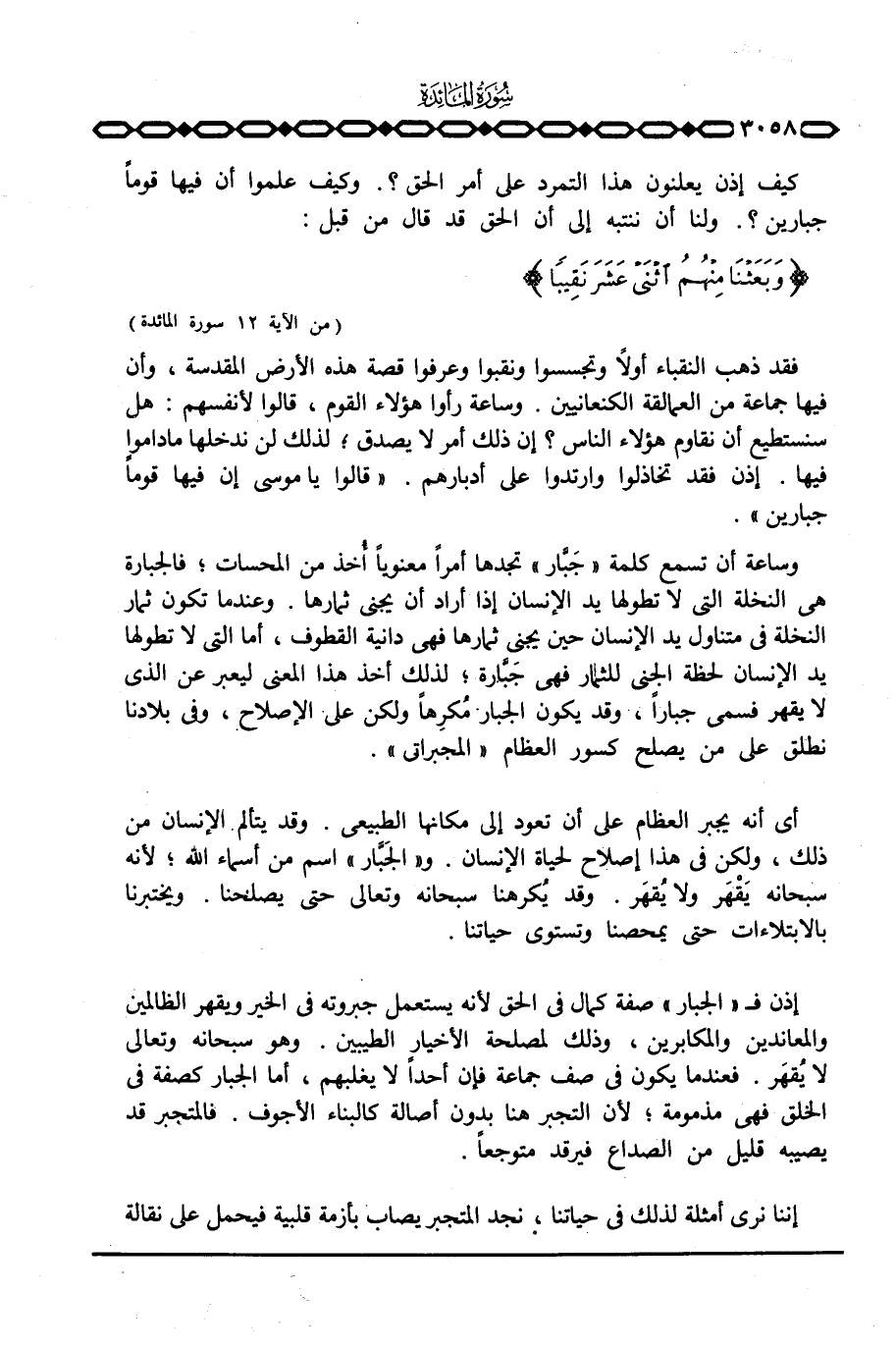 وساعة أن تسمع كلمة «جَبَّار» تجدها أمراً معنوياً أُخذ من المحسات؛ فالجبارة هي النخلة التي لا تطولها يد الإنسان إذا أراد أن يجني ثمارها. وعندما تكون ثمار النخلة في متناول يد الإنسان حين يجني ثمارها فهي دانية القطوف، أما التي لا تطولها يد الإنسان لحظة الجني للثمار فهي جَبَّارة؛ لذلك أخذ هذا المعنى ليعبر عن الذي لا يقهر فسمي جباراً، وقد يكون الجبار مُكرِهاً ولكن على الإصلاح، وفي بلادنا نطلق على من يصلح كسور العظام «المجبراتي» .