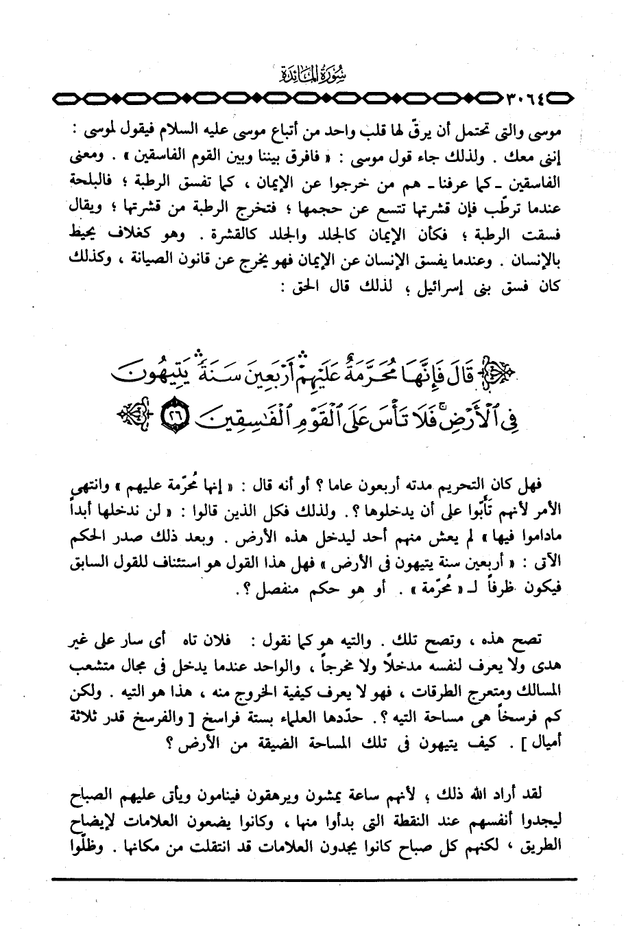 فهل كان التحريم مدته أربعون عاما؟ أو أنه قال: «إنها مُحرّمة عليهم» وانتهى الأمر لأنهم تَأَبّوا على أن يدخلوها؟ . ولذلك فكل الذين قالوا: «لن ندخلها أبداً ماداموا فيها» لم يعش منهم أحد ليدخل هذه الأرض. وبعد ذلك صدر الحكم الآتي: {أَرْبَعِينَ سَنَةً يَتِيهُونَ فِي الأرض} فهل هذا القول هو استئناف للقول السابق فيكون ظرفاً ل «مُحرّمة» . أو هو حكم منفصل؟ .