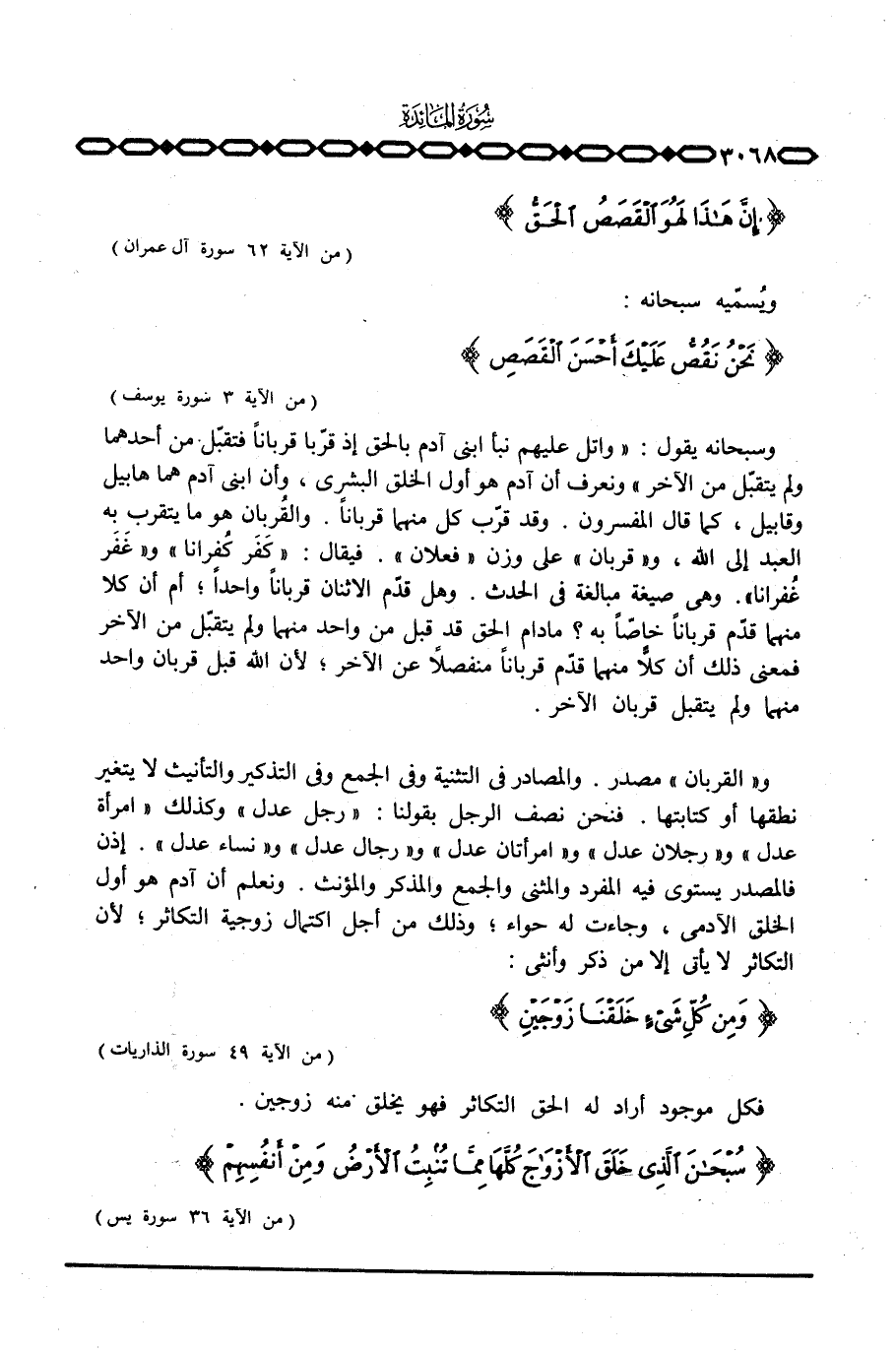 و «القربان: مصدر. والمصادر في التثنية وفي الجمع وفي التذكير والتأنيث لا يتغير نطقها أو كتابتها. فنحن نصف الرجل بقولنا:» رجل عدل «وكذلك» امرأة عدل «و» رجلان عدل «و» امرأتان عدل «و» رجال عدل «و» نساء عدل «. إذن فالمصدر يستوي فيه المفرد والمثنى والجمع والمذكر والمؤنث.