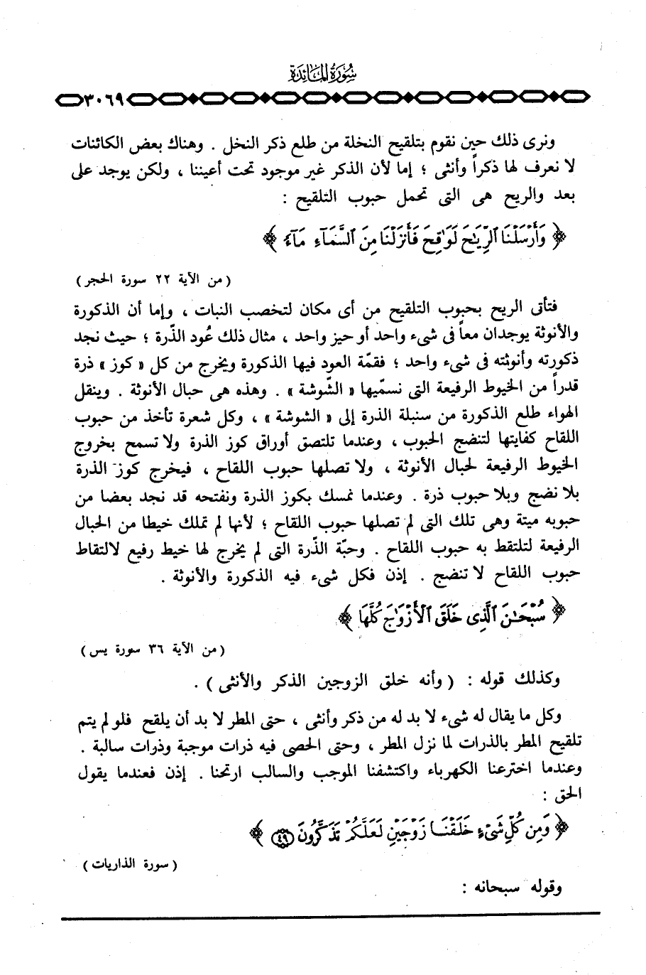 فتأتي الريح بحبوب التلقيح من أي مكان لتخصب النبات، وإما أن الذكورة والأنوثة يوجدان معاً في شيء واحد أو حيز واحد، مثال ذلك عُود الذّرة؛ حيث نجد ذكروته وأنوثته في شيء واحد؛ فقمّة العود فيها الذكورة ويخرج من كل «كوز» ذرة قدراً من الخيوط الرفيعة التي نسمّيها «الشّوشة» . وهذه هي حبال الأنوثة. وينقل الهواء طلع الذكورة من سنبلة الذرة إلى «الشوشة» ، وكل شعرة تأخذ من حبوب اللقاح كفايتها لتنضج الحبوب، وعندما تلتصق أوراق كوز الذرة ولا تسمح بخروج الخيوط الرفيعة لحبال الأنوثة، ولا تصلها حبوب اللقاح، فيخرج كوز الذرة بلا نضج وبلا حبوب ذرة. وعندما نمسك بكوز الذرة ونفتحه قد نجد بعضا من حبوبه ميتة وهي تلك التي لم تصلها حبوب اللقاح؛ لأنها لم تملك خيطا من الحبال الرفيعة لتلتقط به حبوب اللقاح. وحبّة الذّرة التي لم يخرج لها خيط رفيع لالتقاط حبوب اللقاح لا تنضج. إذن فكل شيء فيه الذكورة والأنوثة. {سُبْحَانَ الذي خَلَق الأزواج كُلَّهَا} [يس: 36]