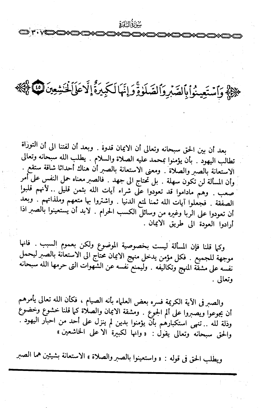 بعد أن بين الحق سبحانه وتعالى أن الإيمان قدوة. وبعد أن لفتنا إلى أن التوراة تطالب اليهود. بأن يؤمنوا بمحمد عَلَيْهِ الصَّلَاة وَالسَّلَام ُ. يطلب الله سبحانه وتعالى الاستعانة بالصبر والصلاة. ومعنى الاستعانة بالصبر أن هناك أحداثا شاقة ستقع. وأن المسألة لن تكون سهلة. بل تحتاج إلى جهد. فالصبر معناه حمل النفس على أمر صعب. وهم ماداموا قد تعودوا على شراء آيات الله بثمن قليل. . لأنهم قلبوا الصفقة. فجعلوا آيات الله ثمنا لمتع الدنيا. واشتروا بها متعهم وملذاتهم. وبعد أن تعودوا على الربا وغيره من وسائل الكسب الحرام. لابد أن يستعينوا بالصبر إذا أرادوا العودة إلى طريق الإيمان.