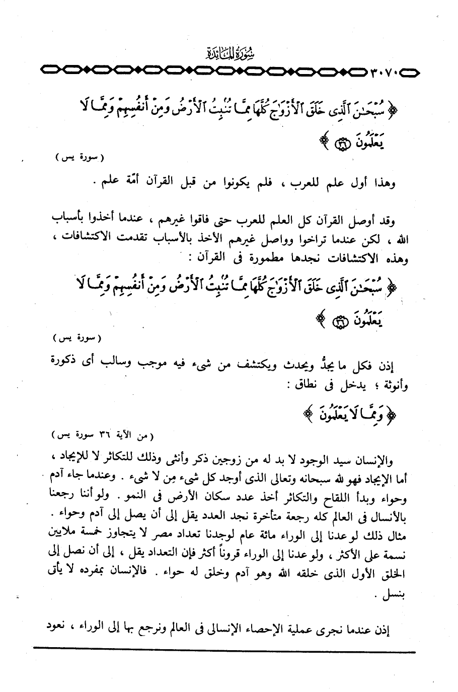 وقد أوصل القرآن كل العلم للعرب حتى فاقوا غيرهم، عندما أحذوا بأسباب الله، لكن عندما تراخوا وواصل غيرهم الأخذ بالأسباب تقدمت الاكتشافات، وهذه الاكتشافات نجدها مطمورة في القرآن: {سُبْحَانَ الذي خَلَق الأزواج كُلَّهَا مِمَّا تُنبِتُ الأرض وَمِنْ أَنفُسِهِمْ وَمِمَّا لاَ يَعْلَمُونَ} [يس: 36]