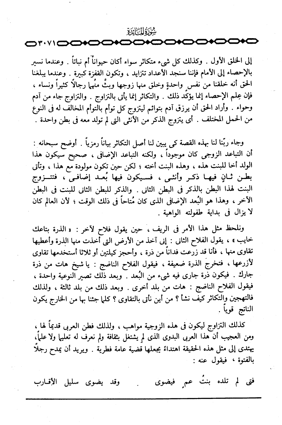 كذلك التزاوج ليكون في هذه الزوجية مواهب، ولذلك فطن العربي قديماً لها، ومن العجيب أن هذا العربي البدوي الذي لم يشتغل بثقافة ولم نعرف له تعليما ولا علماً، يهتدي إلى مثل هذه الحقيقة اهتداءً يجعلها قضية عامة فطرية.