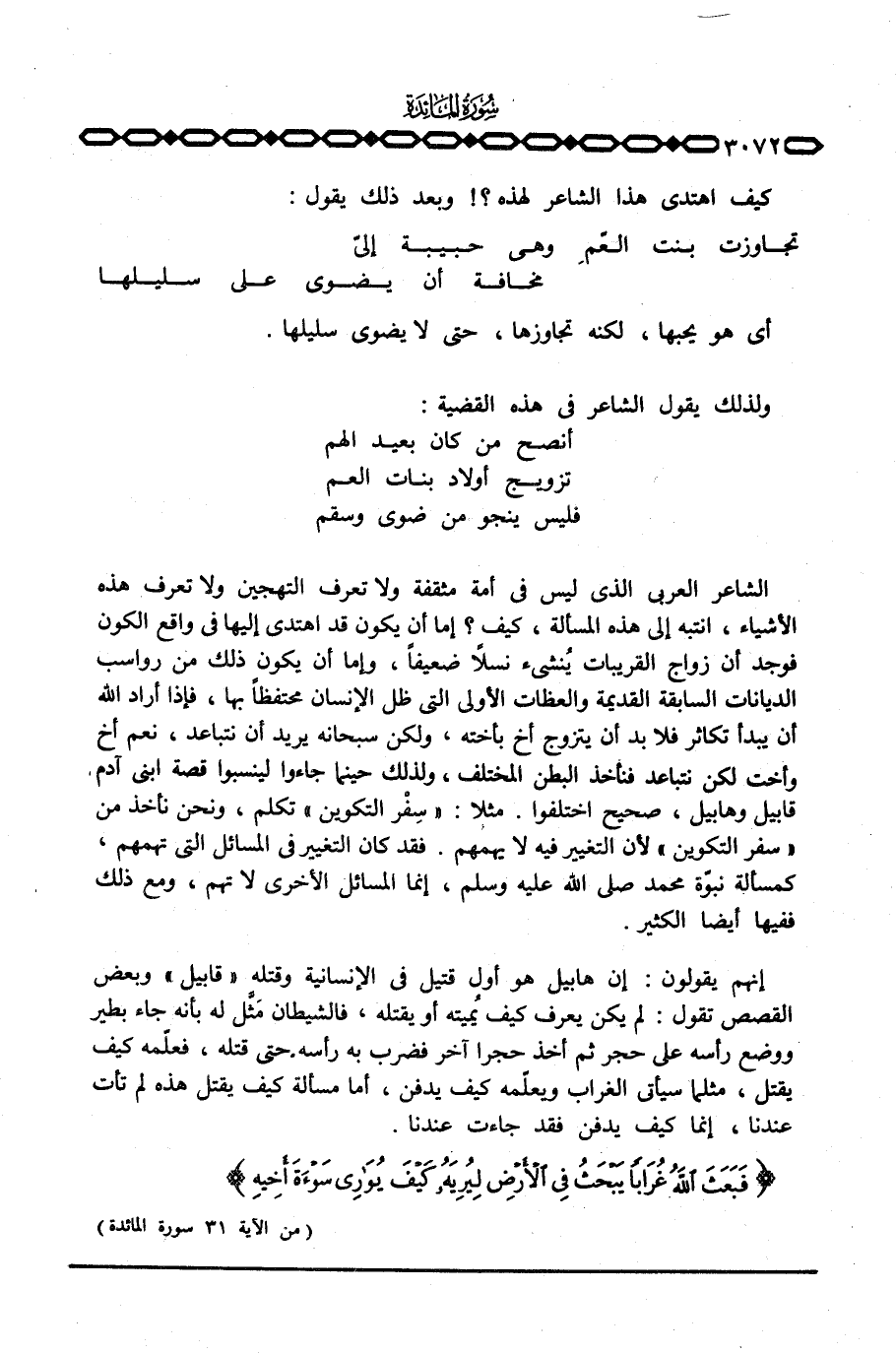 فليس ينجو من ضوى وسقم ... الشاعر العربي الذي ليس في أمة مثقفة ولا تعرف التهجين ولا تعرف هذه الأشياء، انتبه إلى هذه المسألة، كيف؟ إما أن يكون قد اهتدى إليها في واقع الكون فوجد أن زواج القريبات يُنشئ ملاً ضعيفاً، وإما أن يكون ذلك من رواسب الديانات السابقة القديمة والعظات الأولى التي ظل الإنسان محتفظاً بها، فإذا أراد الله أن يبدأ تكاثر فلا بد أن يتزوج أخ بأخته، ولكن سبحانه يريد أن نتباعد، نعم أخ وأخت لكن نتباعد فنأخذ البطن المختلف، ولذلك حينما جاءوا لينسبوا قصة ابني آدم قابيل وهابيل، صحيح اختلفوا. مثلا «سِفْر التكوين» تكلم، ونحن نأخذ من «سفر التكوين» لأن التغيير فيه لا يهمهم. فقد كان التغيير في المسائل التي تهمهم، كمسألة نبوّة محمد صَلَّى اللَّهُ عَلَيْهِ وَسَلَّم َ، إنما المسائل الأخرى لا تهم، ومع ذلك ففيها أيضا الكثير.