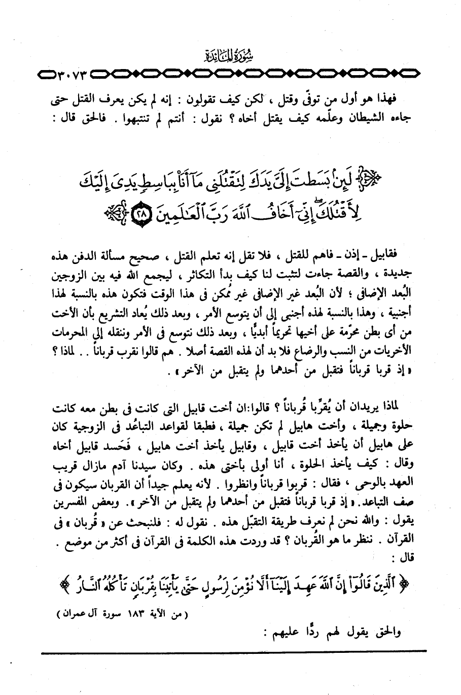 فقابيل - إذن - فاهم للقتل، فلا تقل إنه تعلم القتل، صحيح مسألة الدفن هذه جديدة، والقصة جاءت لتثبت لنا كيف بدأ التكاثر، ليجمع الله فيه بين الزوجين البُعد الإضافي؛ لأن البُعد غير الإضافي غير مُمكن في هذا الوقت فتكون هذه بالنسبة لهذا أجنبية، وهذا بالنسبة لهذه أجنبي إلى أن يتوسع الأمر، وبعد ذلك يُعاد التشريع بأن الأخت من أي بطن محرّمة على أخيها تحريماً أبديًّا، وبعد ذلك نتوسع في الأمر وننقله إلى المحرمات الأخريات من النسب والرضاع فلا بد أن لهذه القصة أصلا. هم قالوا نقرب قرباناً. . لماذا؟ «إذ قربا قرباناً فتقبل من أحدهما ولم يتقبل من الآخر» .