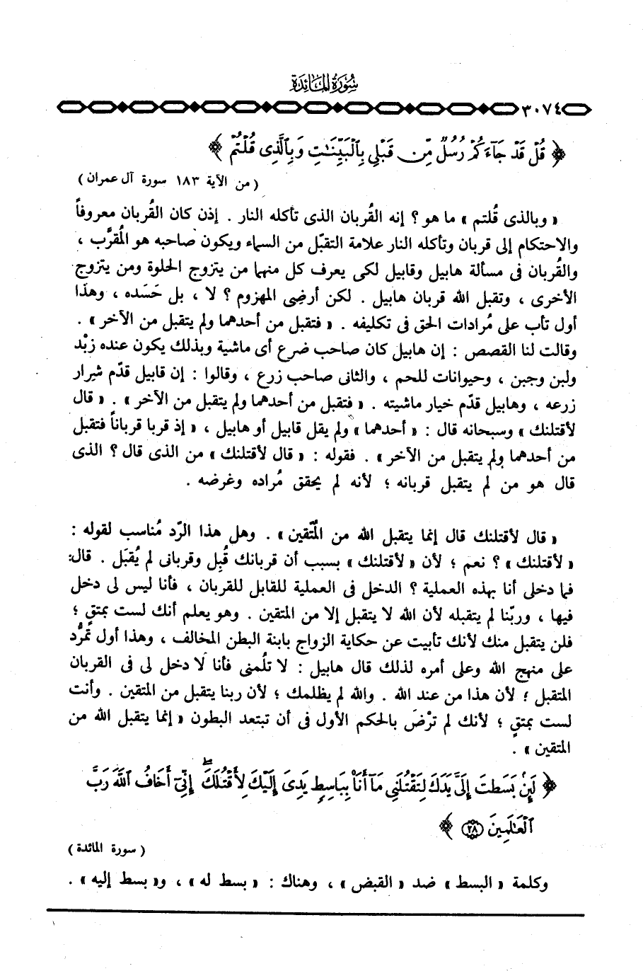 {قَالَ لأَقْتُلَنَّكَ قَالَ إِنَّمَا يَتَقَبَّلُ الله مِنَ المتقين} . وهل هذا الرّد مُناسب لقوله: «لأقتلنك» ؟ نعم؛ لأن «لأقتلنك» بسبب أن قربانك قُبِل وقرباني لم يُقبَل. قال: فما دخلي أنا بهذه العملية؟ الدخل في العملية للقابل للقربان، فأنا ليس لي دخل فيها، وربّنا لم يتقبله لأن الله لا يتقبل إلا من المتقين. وهو يعلم أنك لست بمتقٍ؛ فلن يتقبل منك لأنك تأبيت عن حكاية الزواج بابنة البطن المخالف، وهذا أول تمرُّد على منهج الله وعلى أمره لذلك قال هابيل: لا تلُمني فأنا لا دخل لي في القربان المتقبل؛ لأن هذا من عند الله. والله لم يظلمك؛ لأن ربنا يتقبل من المتقين. وأنت لست بمتقٍ؛ لأنك لم تَرْضَ بالحكم الأول في أن تبتعد البطون {إِنَّمَا يَتَقَبَّلُ الله مِنَ المتقين} . {لَئِن بَسَطتَ إِلَيَّ يَدَكَ لِتَقْتُلَنِي مَآ أَنَاْ بِبَاسِطٍ يَدِيَ إِلَيْكَ لأَقْتُلَكَ إني أَخَافُ الله رَبَّ العالمين} [المائدة: 28]
