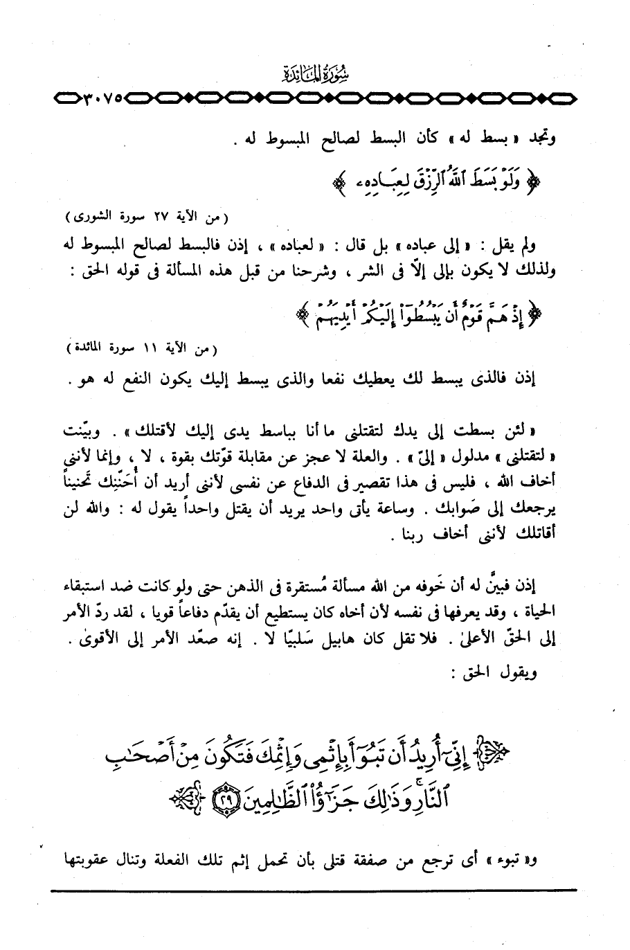 {لَئِن بَسَطتَ إِلَيَّ يَدَكَ لِتَقْتُلَنِي مَآ أَنَاْ بِبَاسِطٍ يَدِيَ إِلَيْكَ لأَقْتُلَكَ} . وبيّنت» لتقتلني «مدلول» إليّ «. والعلة لا عجز عن مقابلة قوّتك بقوة، لا، وإنما لأنني أخاف الله، فليس في هذا تقصير في الدفاع عن نفسي لأنني أريد أن أُحَنّنِك تَحنيناً يرجعك إلى صَوابك. وساعة يأتي واحد يريد أن يقتل واحداً يقول له: والله لن أقاتلك لأنني أخاف ربنا.