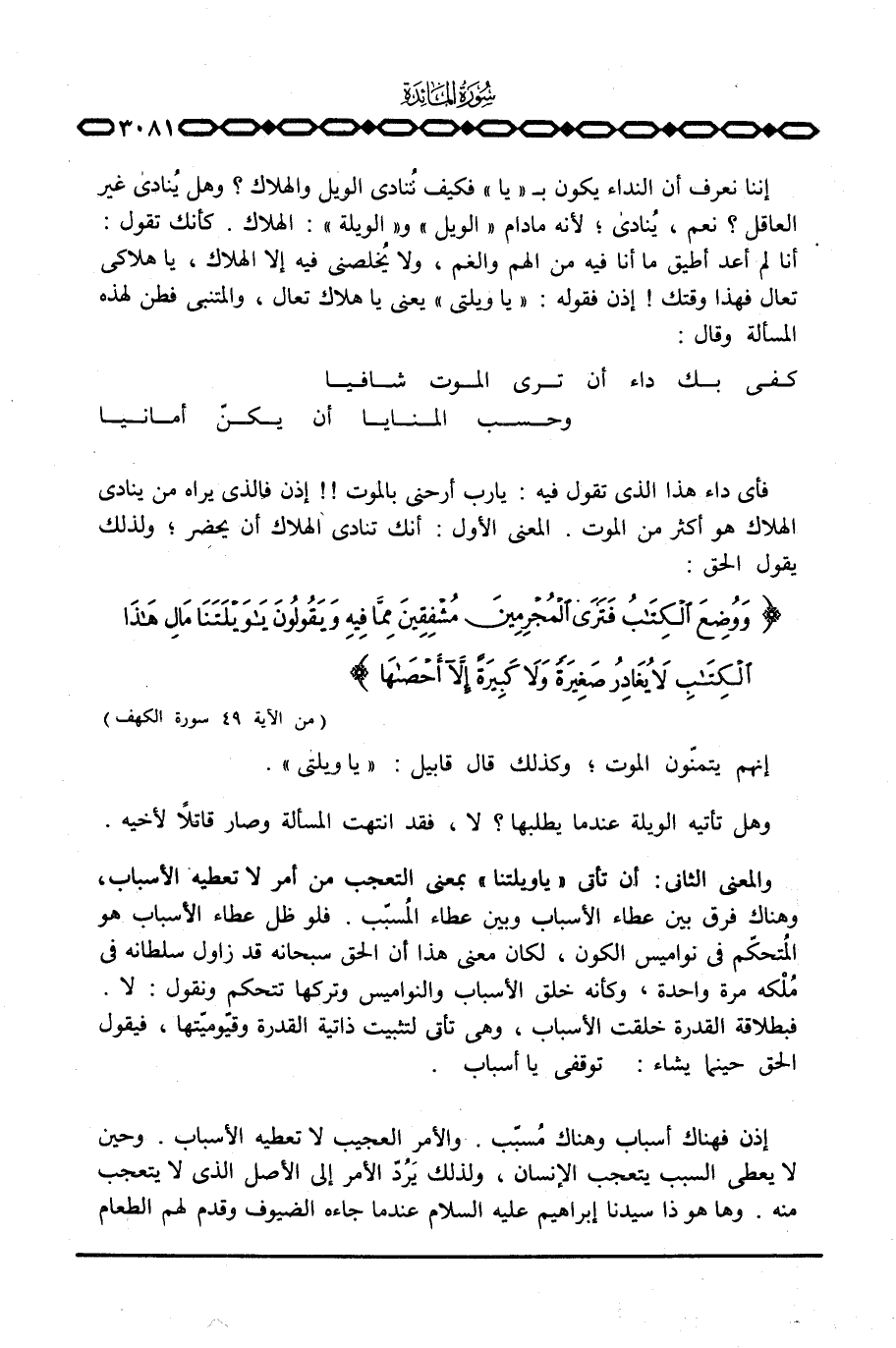 إننا نعرف أن النداء يكون ب «يا» فكيف نُنادي الويل والهلاك؟ وهل يُنادي غير العاقل؟ نعم، يُنادي؛ لأنه مادام «الويل» و «الويلة» : الهلاك. كأنك تقول: أنا لم أعد أطيق ما أنا فيه من الهم والغم، ولا يُخلصني فيه إلا الهلاك، يا هلاكي تعال فهذا وقتك {إذن فقوله: «يا ويلتي» يعني يا هلاك تعال، والمتنبي فطن لهذه المسألة وقال: