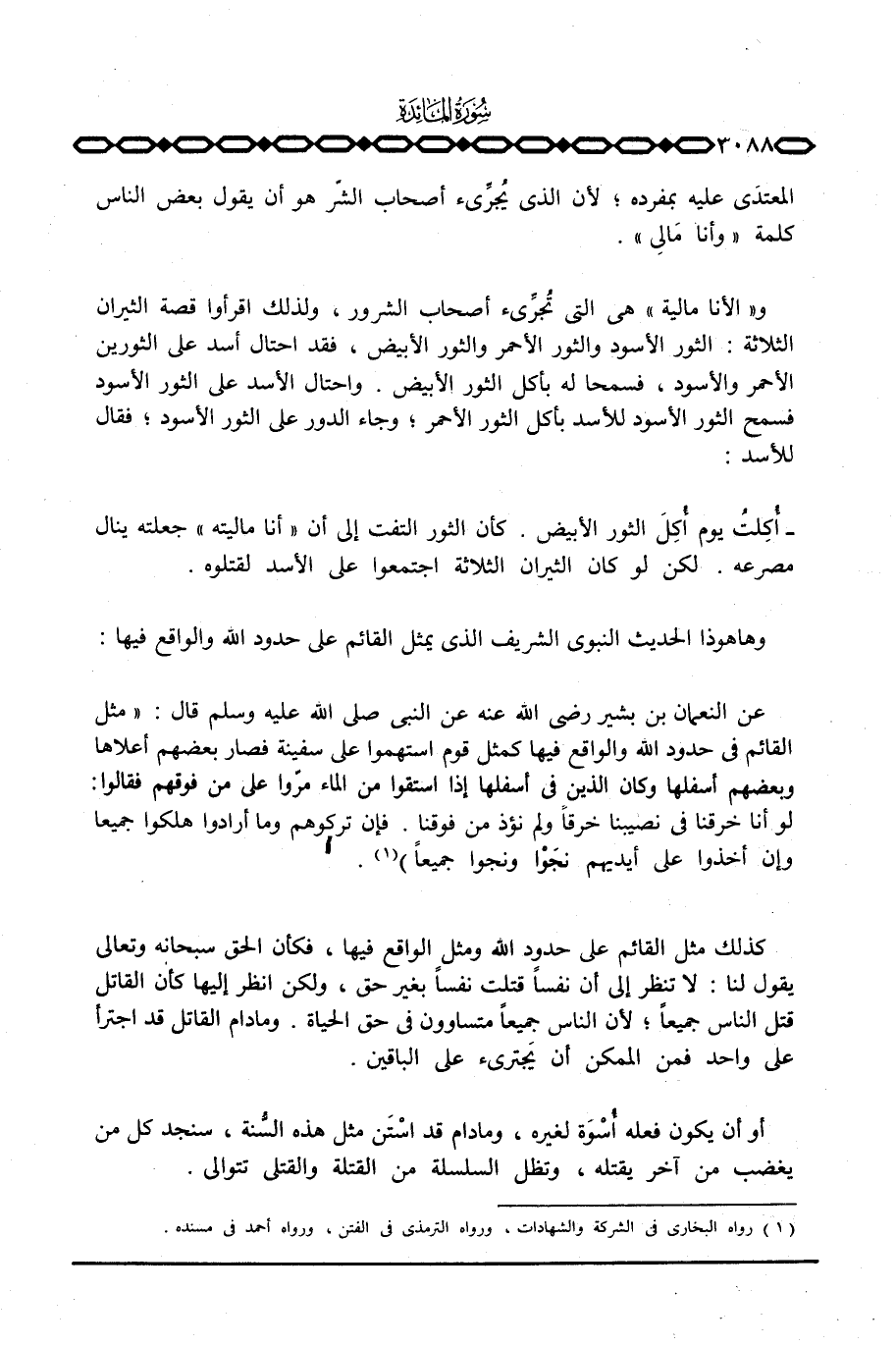 عن النعمان بن بشير رَضِيَ اللَّهُ عَنْه عن النبي صَلَّى اللَّهُ عَلَيْهِ وَسَلَّم َ قال: «مثل القائم في حدود الله والواقع فيها كمثل قوم استهموا على سفينة فصار بعضهم أعلاها وبعضهم أسفلها وكان الذين في أسفلها إذا استقوا من الماء مرّوا على من فوقهم فقالوا: لو أنا خرقنا في نصيبنا خرقاً ولم نؤذ من فوقنا. فإن تركوهم وما أرادوا هلكوا جميعا وإن أخذوا على أيديهم نجَوْا ونجوا جميعاً»