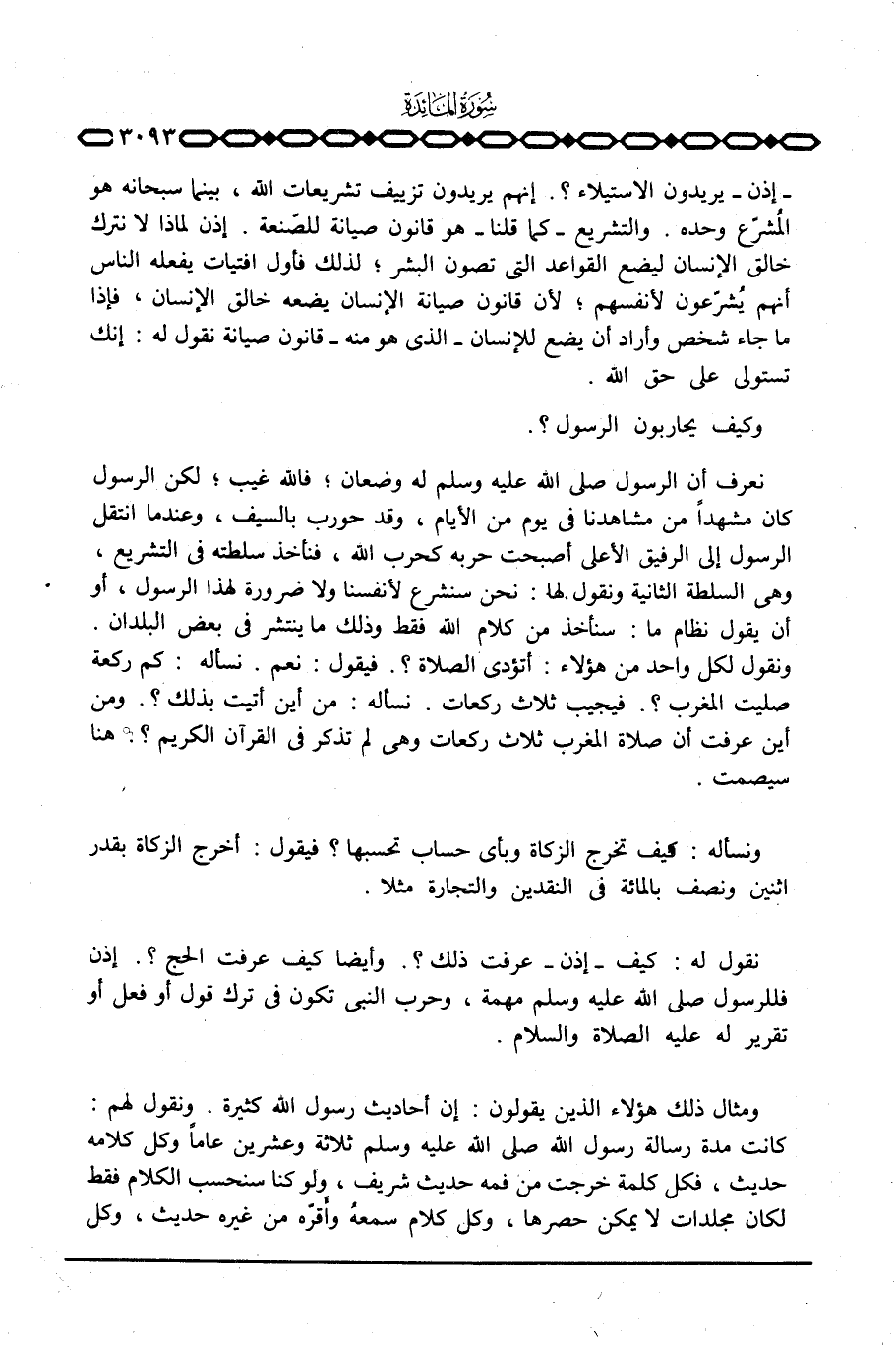 نعرف أن الرسول صَلَّى اللَّهُ عَلَيْهِ وَسَلَّم َ له وضعان؛ فالله غيب؛ لكن الرسول كان مشهداً من مشاهدنا في يوم من الأيام، وقد حورب بالسيف، وعندما انتقل الرسول إلى الرفيق الأعلى أصبحت حربه كحرب الله، فنأخذ سلطته في التشريع، وهي السلطة الثانية ونقول لها: نحن سنشرع لأنفسنا ولا ضرورة لهذا الرسول، أو أن يقول نظام ما: سنأخذ من كلام الله فقط وذلك ما ينتشر في بعض البلدان. ونقول لكل واحد من هؤلاء: أتؤدي الصلاة؟ . فيقول: نعم. نسأله: كم ركعة صليت المغرب؟ . فيجيب ثلاث ركعات. نسأله: من أين أتيت بذلك؟ . ومن أين عرفت أن صلاة المغرب ثلاث ركعات وهي لم تذكر في القرآن الكريم؟ . هنا سيصمت.