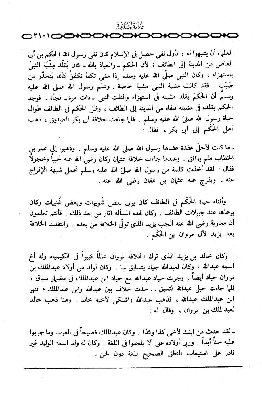 العلماء أن ينتبهوا له، فأول نفي حصل في الإسلام كان نفي رسول الله الحَكَم بن أبي العاص من المدينة إلى الطائف؛ لأن الحكم - والعياذ بالله - كان يُقلّد مِشّيَة النبيّ باستهزاء، وكان النبي صلّى الله عليه وسلم إذا مشى تكفأ تكفؤاً كأنما يَتَحدَّر من صَبَبٍ. فقد كانت مشية النبي مشية خاصة. وعلم رسول الله صَلَّى اللَّهُ عَلَيْهِ وَسَلَّم َ أن الحَكَمَ يقلد مِشيته في استهزاء والتفت النبي - ذات مرة - فجأة، فوجد الحكم يقلده في مِشيته فنفاه من المدينة إلى الطائف، وظل الحكم في الطائف طوال حياة رسول الله صلّى الله عليه وسلم.