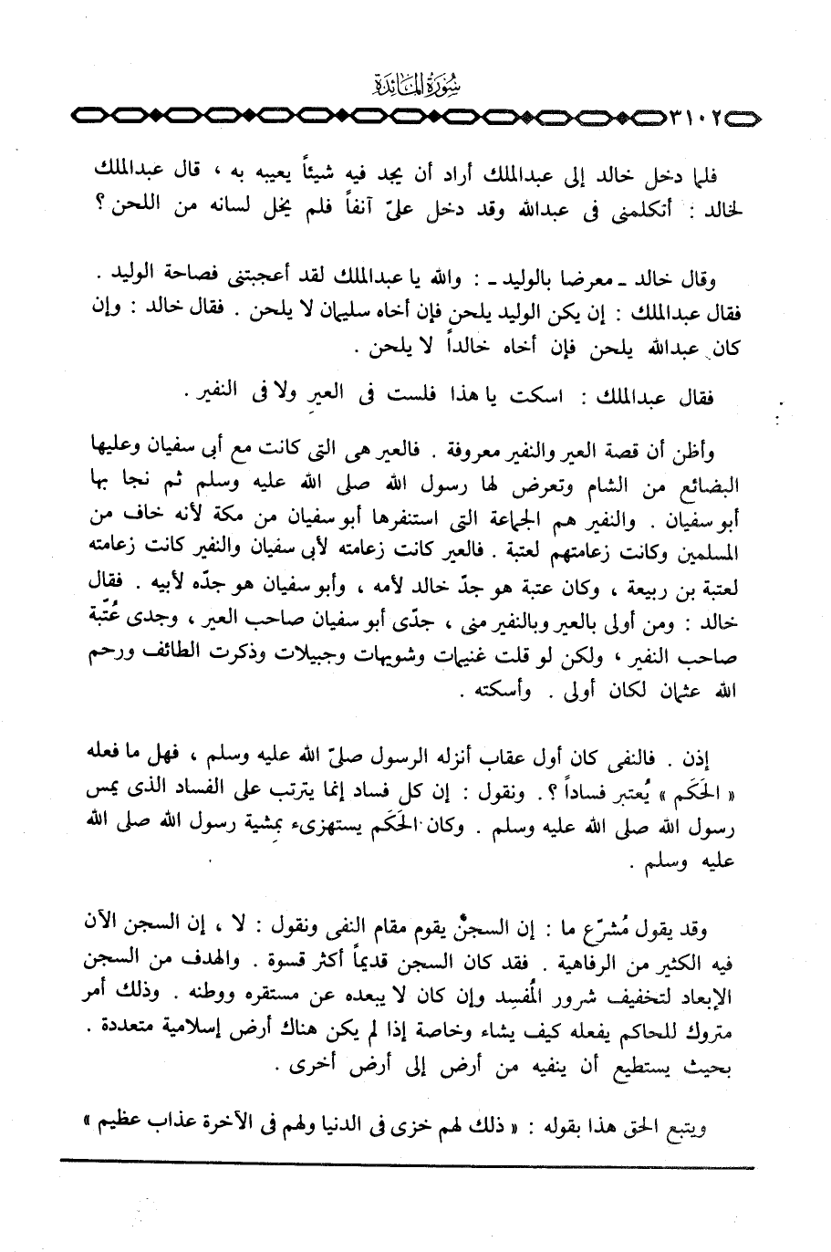 إذن. فالنفي كان أول عقاب أنزله الرسول صلّى الله عليه وسلم، فهل ما فعله «الحَكَم» يُعتبر فساداً؟ . ونقول: إن كل فساد غنما يترتب على الفساد الذي يمس رسول الله صَلَّى اللَّهُ عَلَيْهِ وَسَلَّم َ. وكان الحَكَم يستهزئ بمِشية رسول الله صَلَّى اللَّهُ عَلَيْهِ وَسَلَّم َ.