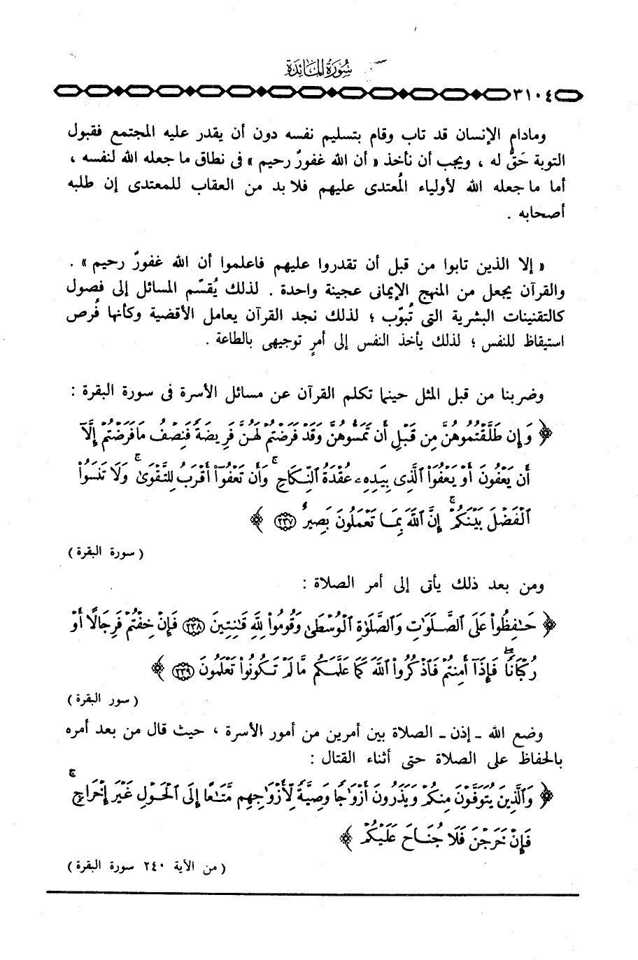 {إِلاَّ الذين تَابُواْ مِن قَبْلِ أَن تَقْدِرُواْ عَلَيْهِمْ فاعلموا أَنَّ الله غَفُورٌ رَّحِيمٌ} . والقرآن يجعل من المنهج الإيماني عجينة واحدة. لذلك يُقسّم المسائل إلى فصول كالتقنيات البشرية التي تُبوّب؛ لذلك نجد القرآن يعامل الأقضية وكأنها فُرص استيقاظ للنفس؛ لذلك يأخذ النفس إلى أمرٍ توجيهي بالطاعة.