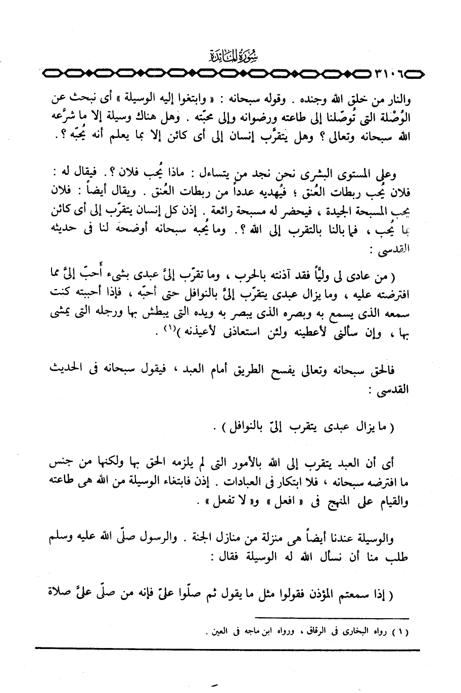 «من عادى لي وليَّاً فقد آذنته بالحرب، وما تقرّب إليَّ عبدي بشيء أَحبّ إليَّ مما افترضته عليه، وما يزال عبدي يتقرّب إليَّ بالنوافل حتى أحبّه، فإذا أحببته كنت سمعه الذي يسمع به وبصره الذي يبصر به ويده التي يبطش بها ورجله التي يمشي بها، وإن سألني لأعطينه ولئن استعاذني لأعيذنه»