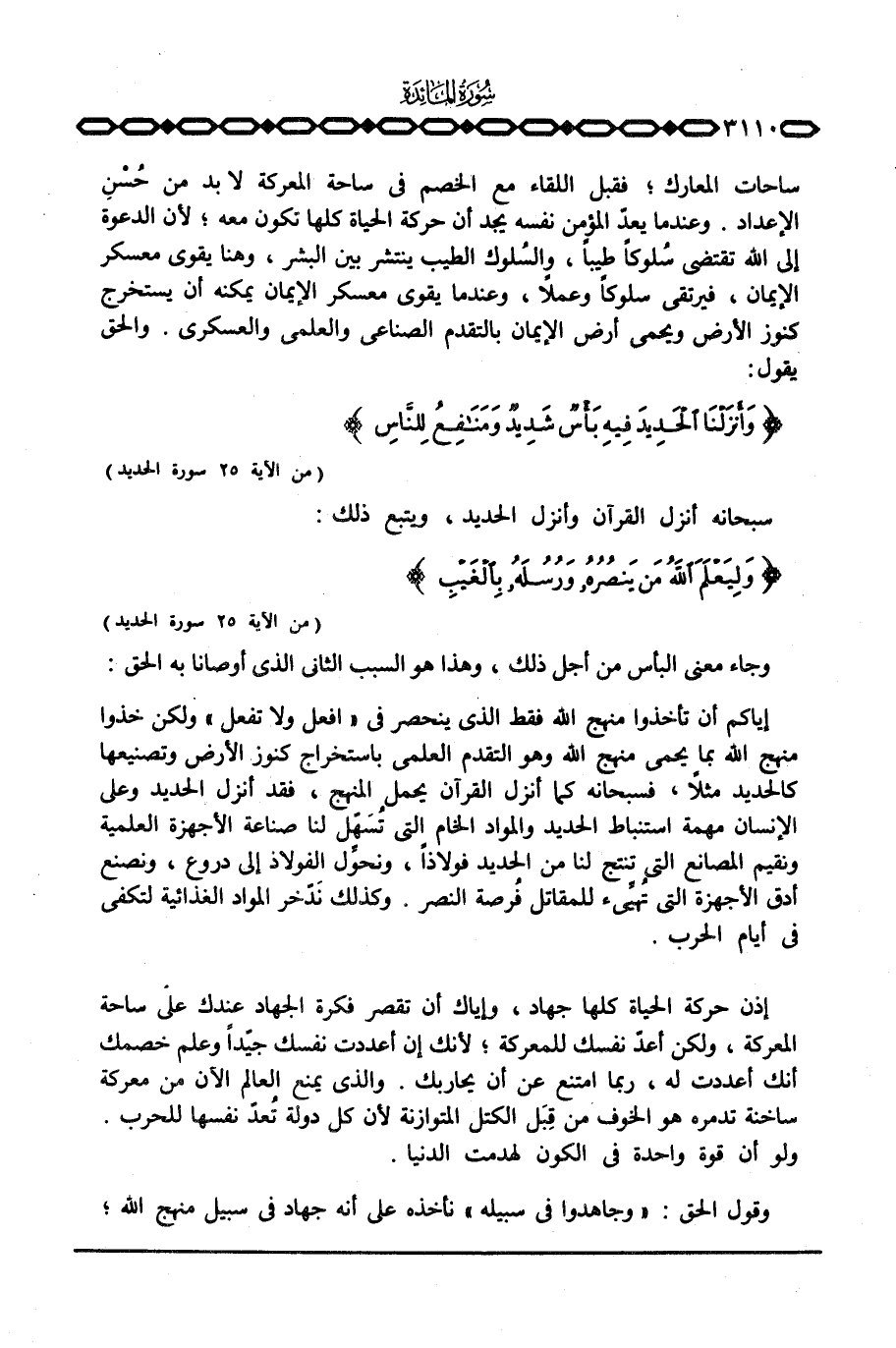 إياكم أن تأخذوا منهج الله فقط الذي ينحصر في «افعل ولا تفعل» ولكن خذوا منهج الله بما يحمي منهج الله وهو التقدم العلمي باستخراج كنوز الأرض وتصنيعها كالحديد مثلاً، فسبحانه كما أنزل القرآن يحمل المنهج، فقد أنزل الحديد وعلى الإنسان مهمة استنباط الحديد والمواد الخام التي تُسَهّل لنا صناعة الأجهزة العلمية ونقيم المصانع التي تنتج لنا من الحديد فولاذاً، ونحوِّل الفولاذ إلى دروع، ونصنع أدق الأجهزة التي تُهِّيئ للمقاتل فُرصة النصر. وكذلك نَدّخر المواد الغذائية لتكفي في أيام الحرب.