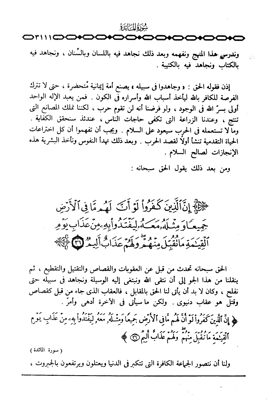الحق سبحانه تحدث من قبل عن العقوبات والقصاص والتقتيل والتقطيع، ثم ينقلنا من هذا الجو إلى أن نتقي الله ونبتغي إليه الوسيلة ونجاهد في سبيله حتى نفلح، وكان لا بد أن يأتي لنا الحق بالمقابل، فالعقاب الذي جاء من قبل كقصاص وقتل هو عقاب دنيوي. ولكن ما سيأتي في الآخرة أدهى وأمرّ. {إِنَّ الذين كَفَرُواْ لَوْ أَنَّ لَهُمْ مَّا فِي الأرض جَمِيعاً وَمِثْلَهُ مَعَهُ لِيَفْتَدُواْ بِهِ مِنْ عَذَابِ يَوْمِ القيامة مَا تُقُبِّلَ مِنْهُمْ وَلَهُمْ عَذَابٌ أَلِيمٌ} [المائدة: 36]