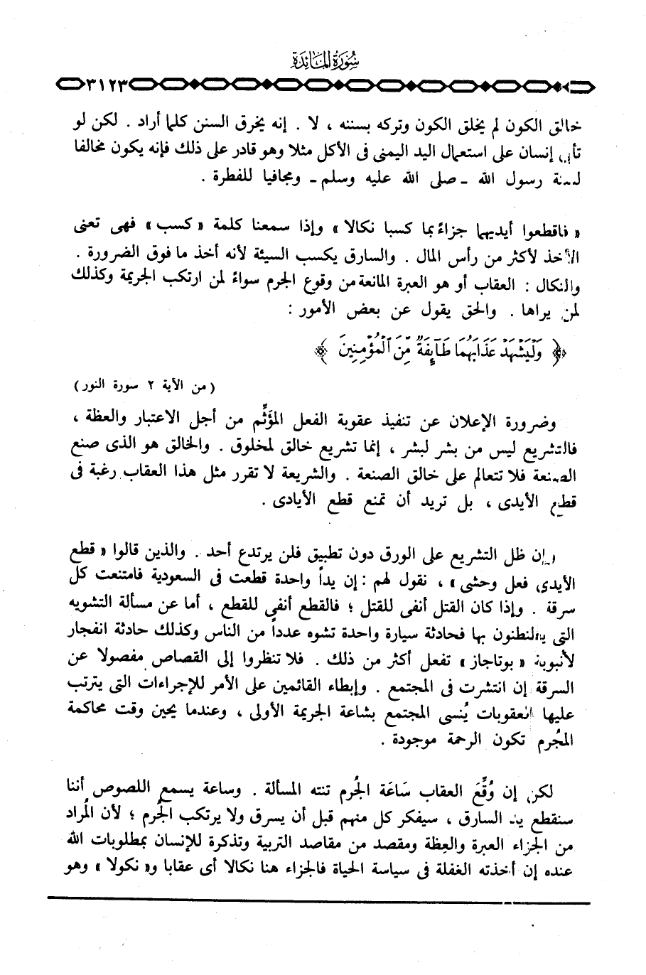 وضرورة الإعلان عن تنفيذ عقوبة الفعل المؤَثِّم من أجل الاعتبار والعظة، فالتشريع ليس من بشر لبشر، إنما تشريع خالق لمخلوق. والخالق هو الذي صنع الصنعة فلا تتعالم على خالق الصنعة. والشريعة لا تقرر مثل هذا العقاب رغبة في قطع الأيدي، بل تريد أن تمنع قطع الأيادي.