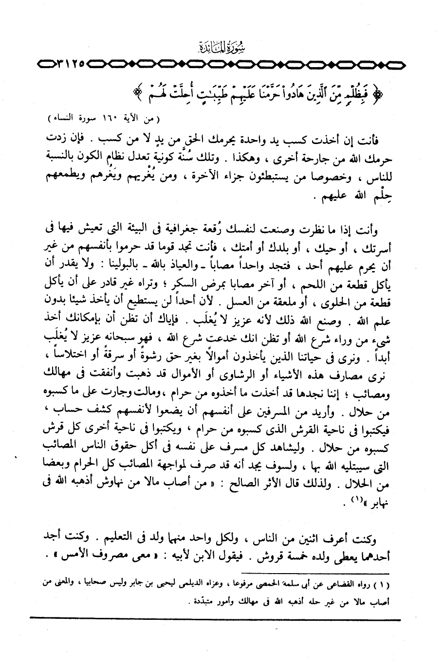 وأنت إذا ما نظرت وصنعت لنفسك رُقعة جغرافية في البيئة التي تعيش فيها في أسرتك، أو حيك، أو بلدك أو أمتك، فأنت تجد قوما قد حرموا بأنفسهم من غير أن يحرم عليهم أحد، فتجد واحداً مصاباً - والعياذ بالله - بالبولينا: ولا يقدر أن يأكل قطعة من اللحم، أو آخر مصابا بمرض السكر؛ وتراه غير قادر على أن يأكل قطعة من الحلوى، أو ملعقة من العسل. لأن أحداً لن يستطيع أن يأخذ شيئا بدون علم الله. وصنع الله ذلك لأنه عزيز لا يُغلَب. فإياك أن تظن أن بإمكانك أخذ شيء من وراء شرع الله أو تظن انك خدعت شَرع الله، فهو سبحانه عزيز لا يُغلَب أبداً. ونرى في حياتنا الذين يأخذون أموالاً بغير حق رشوة أو سرقةً أو اختلاساً، نرى مصارف هذه الأشياء أو الرشاوي أو الأموال قد ذهبت وأنفقت في مهالك ومصائب؛ إننا نجدها قد أخذت ما أخذوه من حرام، ومالت وجارت على ما كسبوه من حلال. وأريد من المسرفين على أنفسهم أن يضعوا لأنفسهم كشف حساب، فيكتبوا في ناحية القرش الذي كسبوه من حرام، ويكتبوا في ناحية أخرى كل قرش كسبوه من حلال. وليشاهد كل مسرف على نفسه في أكل حقوق الناس المصائب التي سيبتليه الله بها، ولسوف يجد أنه قد صرف لمواجهة المصائب كل الحرام وبعضا من الحلال. ولذلك قال الأثر الصالح: «من أصاب مالا من نهاوش أذهبه الله في نهابر» .