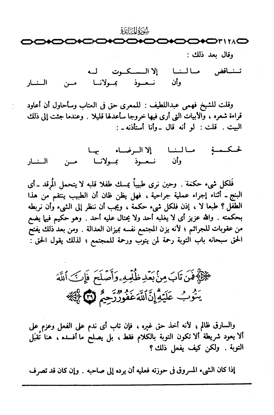 فَلكل شيء حكمة. وحين نرى طبيباً يمسك طفلا قلبه لا يتحمل المُرِقد - أي البنج - أثناء إجراء عملية جراحية، فهل يظن ظان أن الطبيب ينتقم من هذا الطفل؟ طبعا لا، إذن فلكل شيء حكمة، ويجب أن ننظر إلى الشيء وأن نربطه بحكمته. والله عزيز أي لا يغلبه أحد ولا يحتال عليه أحد. وهو حكيم فيما يضع من عقوبات للجرائم؛ لأنه يزن المجتمع نفسه بميزان العدالة. ومن بعد ذلك يفتح الحق سبحانه باب التوبة رحمة لمن يتوب ورحمة للمجتمع؛ لذلك يقول الحق: {فَمَن تَابَ مِن بَعْدِ ... }