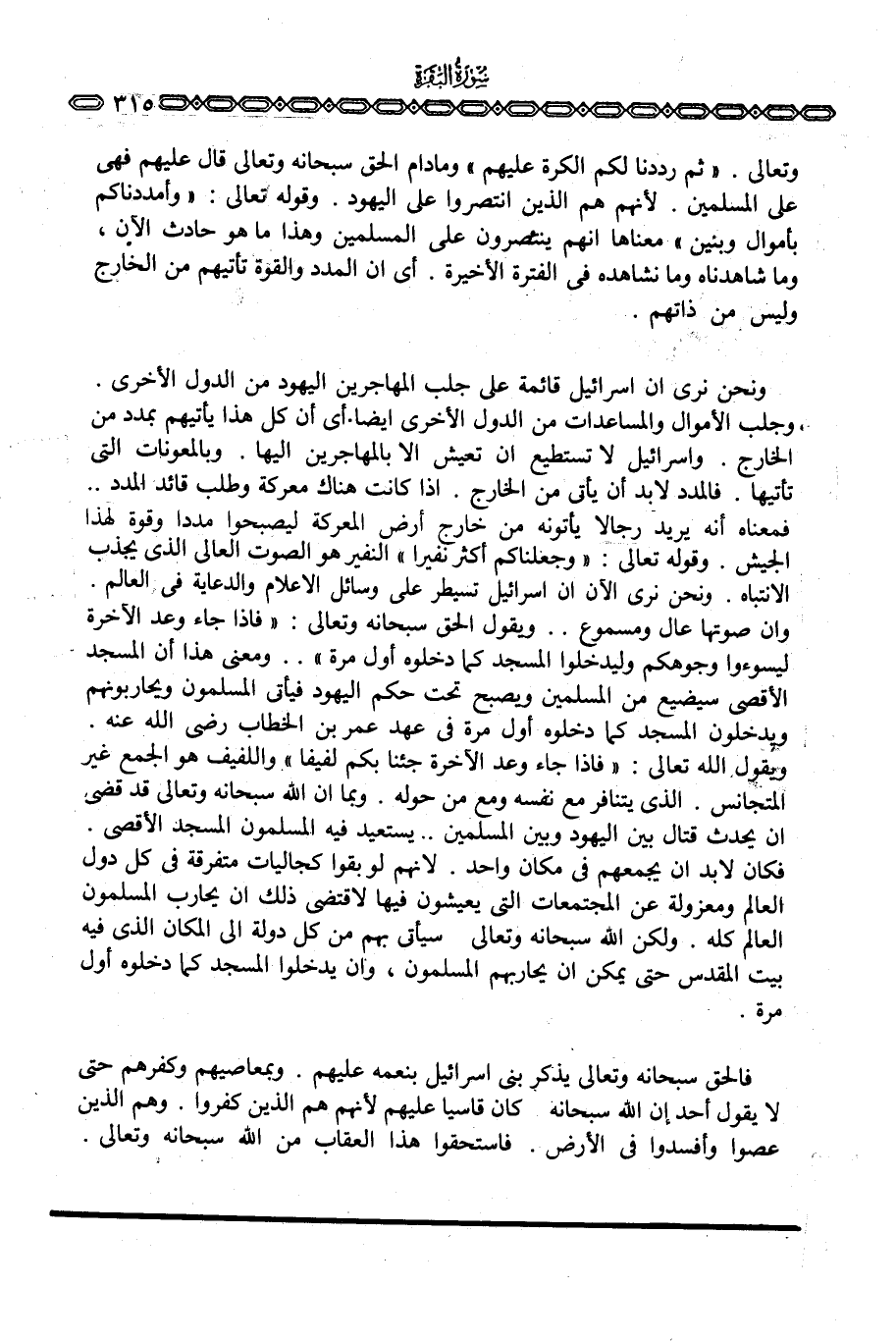 وتعالى. {ثُمَّ رَدَدْنَا لَكُمُ الكرة عَلَيْهِمْ} ومادام الحق سبحانه وتعالى قال عليهم فهي على المسلمين. لأنهم هم الذين انتصروا على اليهود. وقوله تعالى: {وَأَمْدَدْنَاكُم بِأَمْوَالٍ وَبَنِينَ} معناها أنهم ينتصرون على المسلمين وهذا ما هو حادث الآن، وما شاهدناه وما نشاهده في الفترة الأخيرة. أي أن المدد والقوة تأتيهم من الخارج وليس من ذاتهم.
